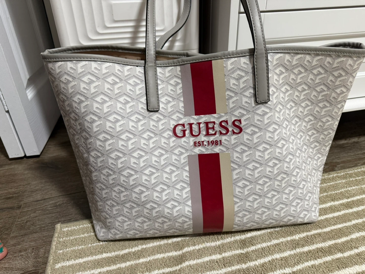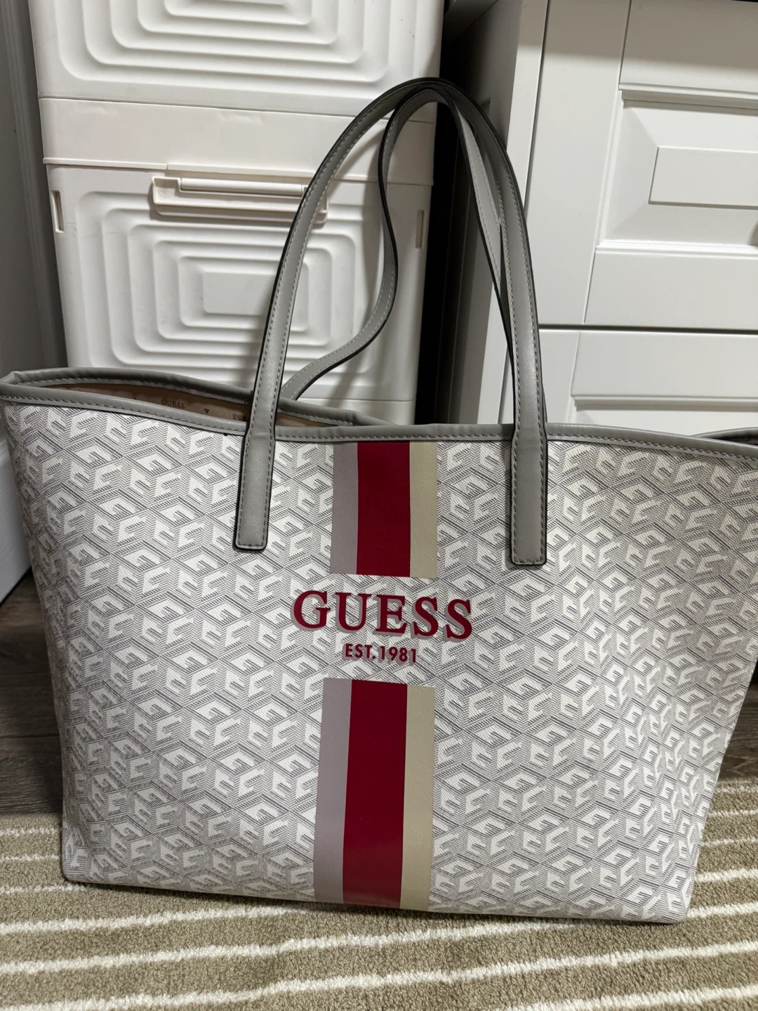 Selling a Guess tote bag in a stylish white and grey pattern! It features the Guess logo with red and beige stripes. Perfect for carrying your essentials in style!