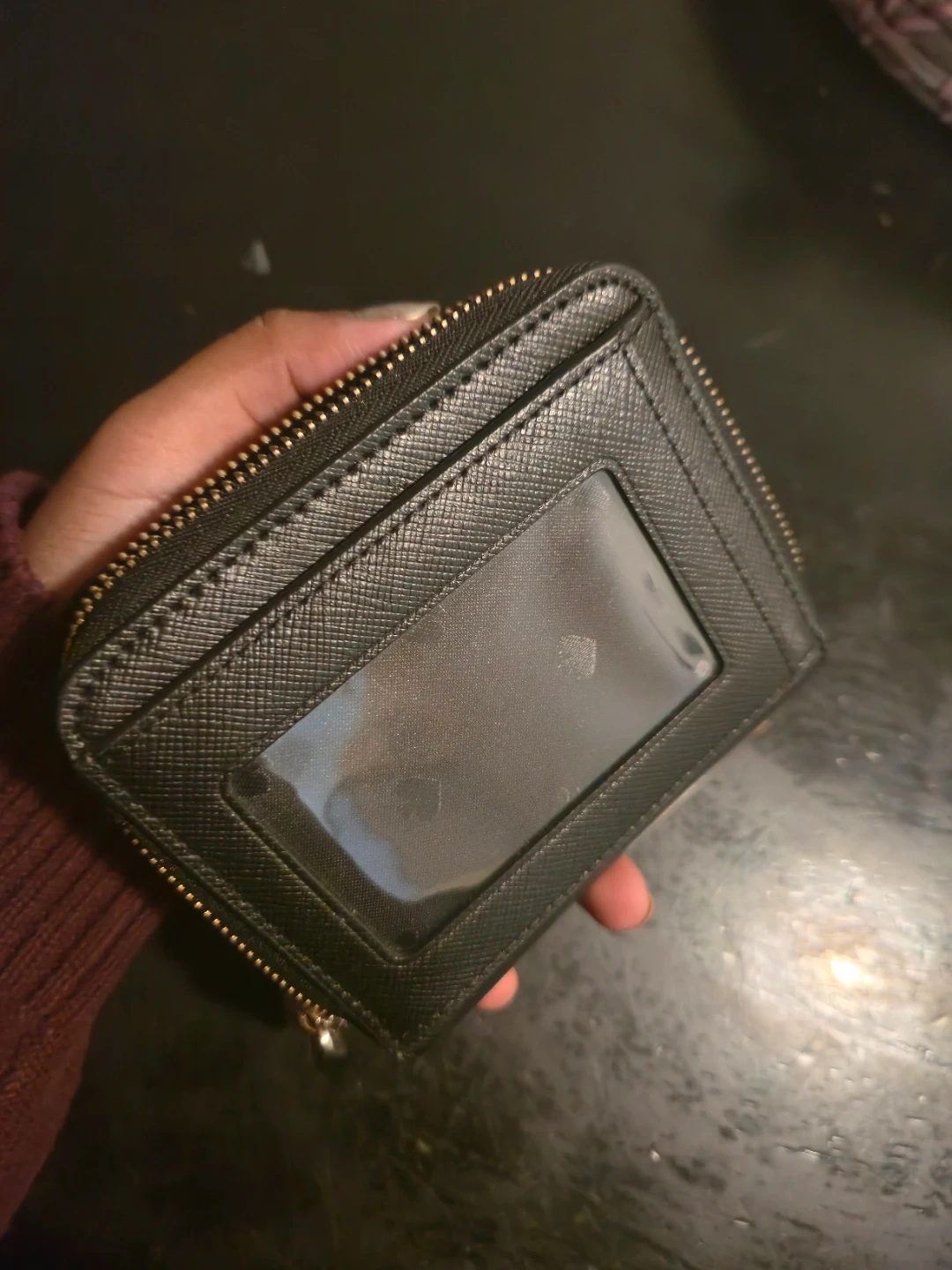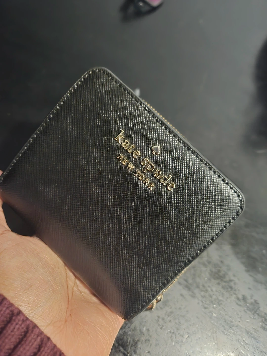 This is a black Kate Spade bifold wallet. It's made of leather and features multiple card slots and a zip coin pocket. This wallet would be handy for organizing your essentials.