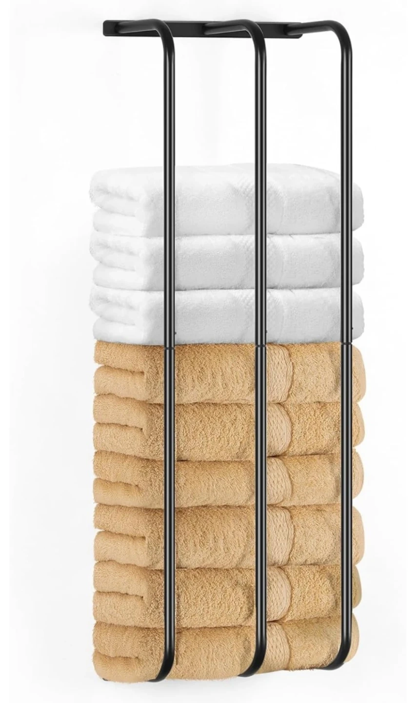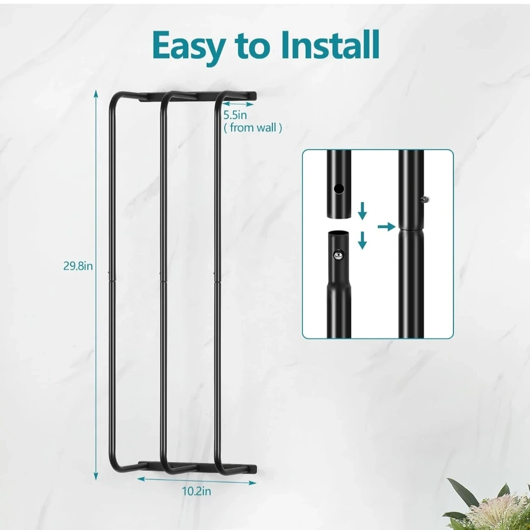 Large capacity towel rack holding up to 6 extra large towels. It's easy to install and has a compact design. It measures 29.8in tall, 10.2in wide, and extends 5.5in from the wall. This rack is useful for keeping towels organized in a bathroom or laundry room.