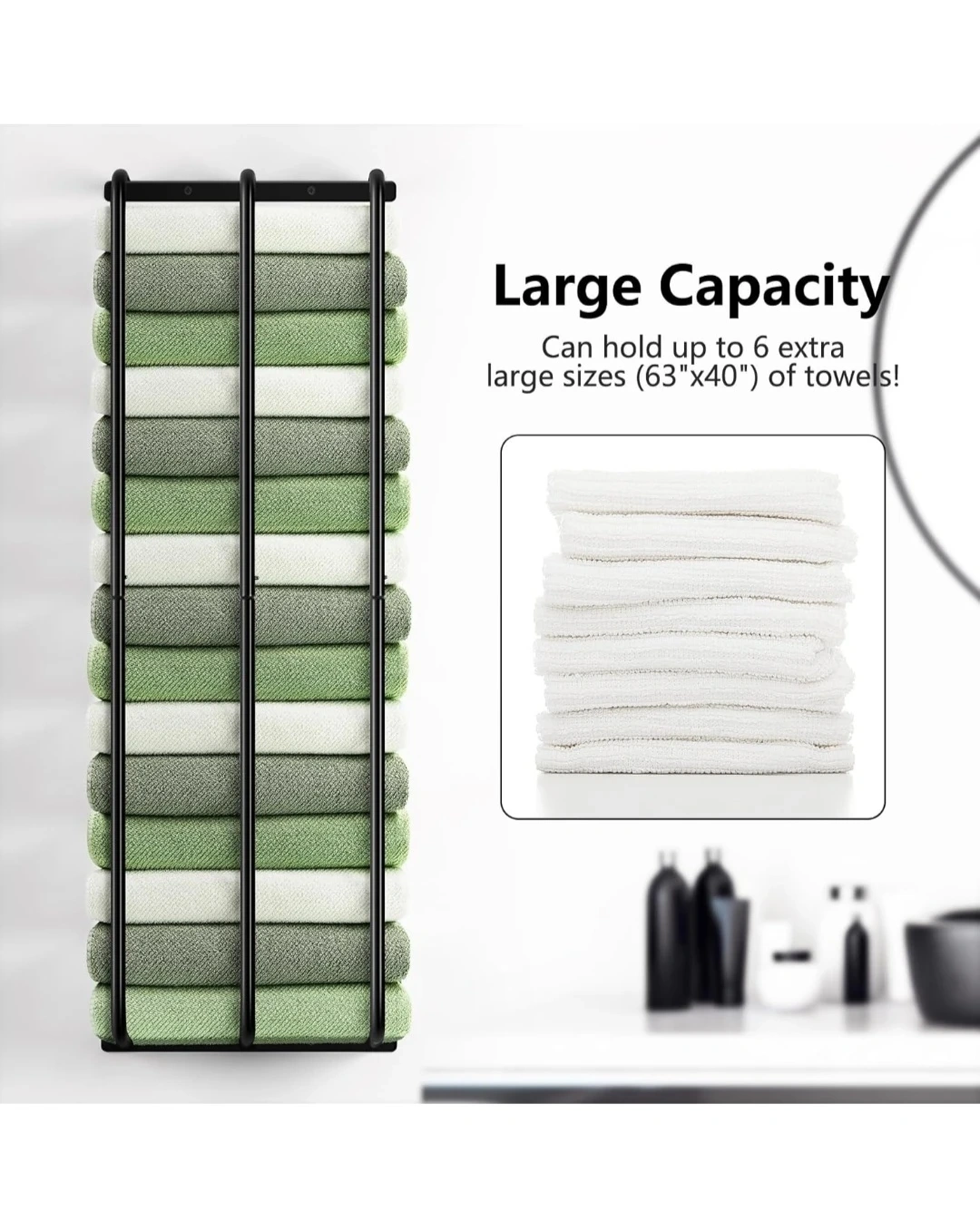 Large capacity towel rack holding up to 6 extra large towels. It's easy to install and has a compact design. It measures 29.8in tall, 10.2in wide, and extends 5.5in from the wall. This rack is useful for keeping towels organized in a bathroom or laundry room.