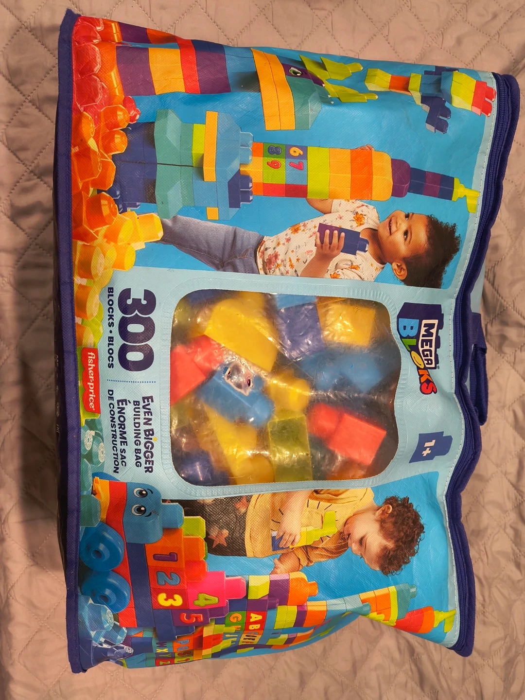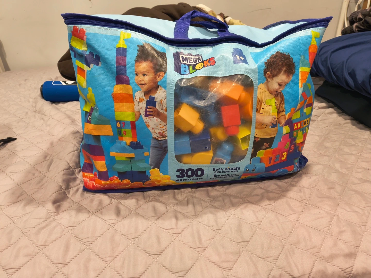 Mega Bloks building bag with 300 pieces. Includes various colors and shapes for building. Recommended for ages 1 and up.