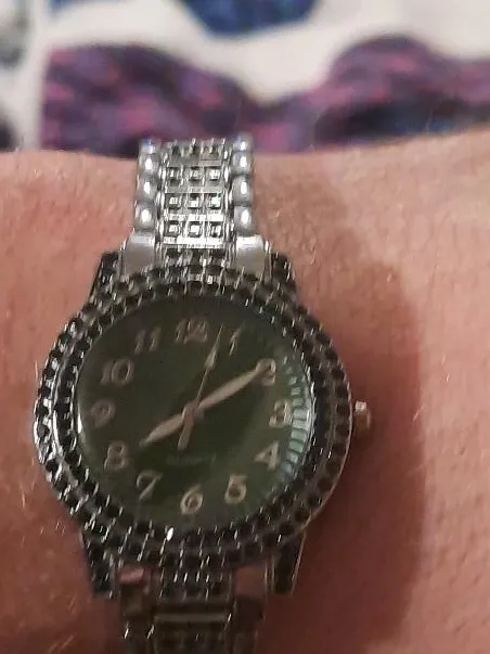 This watch features a green dial with silver-tone hands and hour markers. It has a decorative, jeweled bezel and a silver-tone metal band. A quartz movement ensures accurate timekeeping. It's a stylish accessory for everyday wear.150 or best offer
