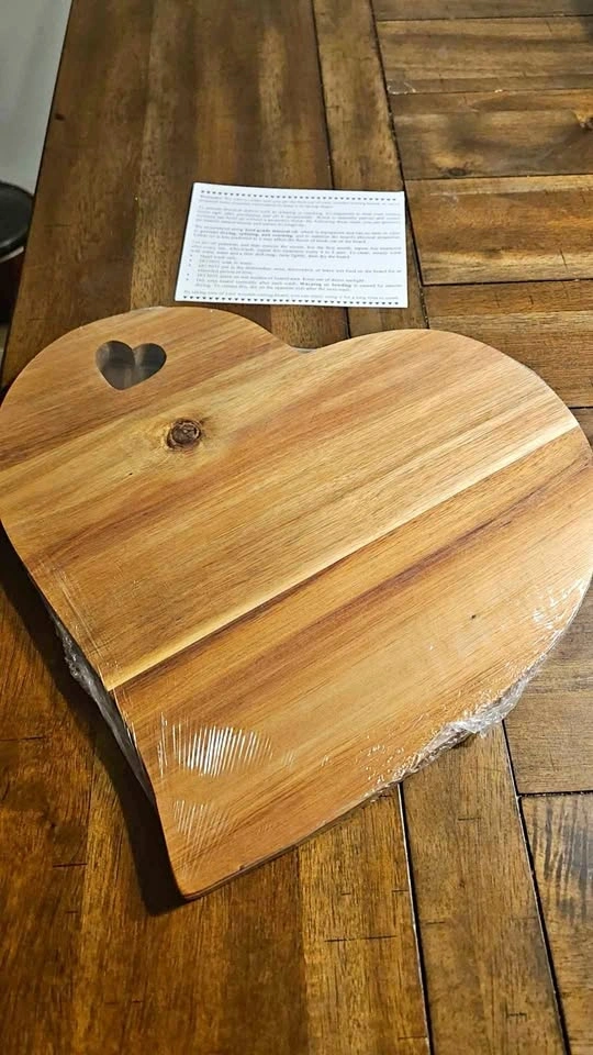 New heart-shaped wood cutting board. Still in plastic wrap. Has a cute little heart cut out. Good for serving snacks or as a gift.