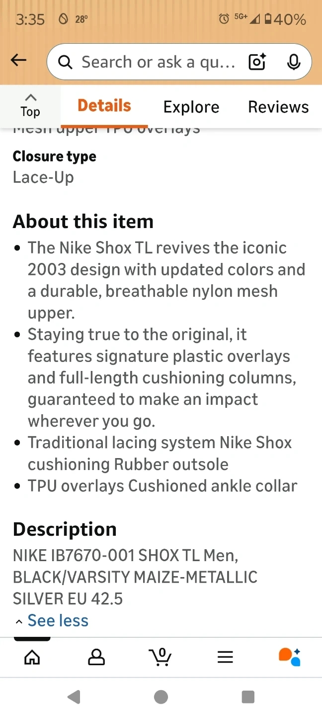 Size 12 These Nike Shox TL shoes revive the iconic 2003 design. They feature a durable, breathable nylon mesh upper with updated colors. The full-length cushioning columns and rubber outsole provide comfort and impact resistance. Lace-up closure.
