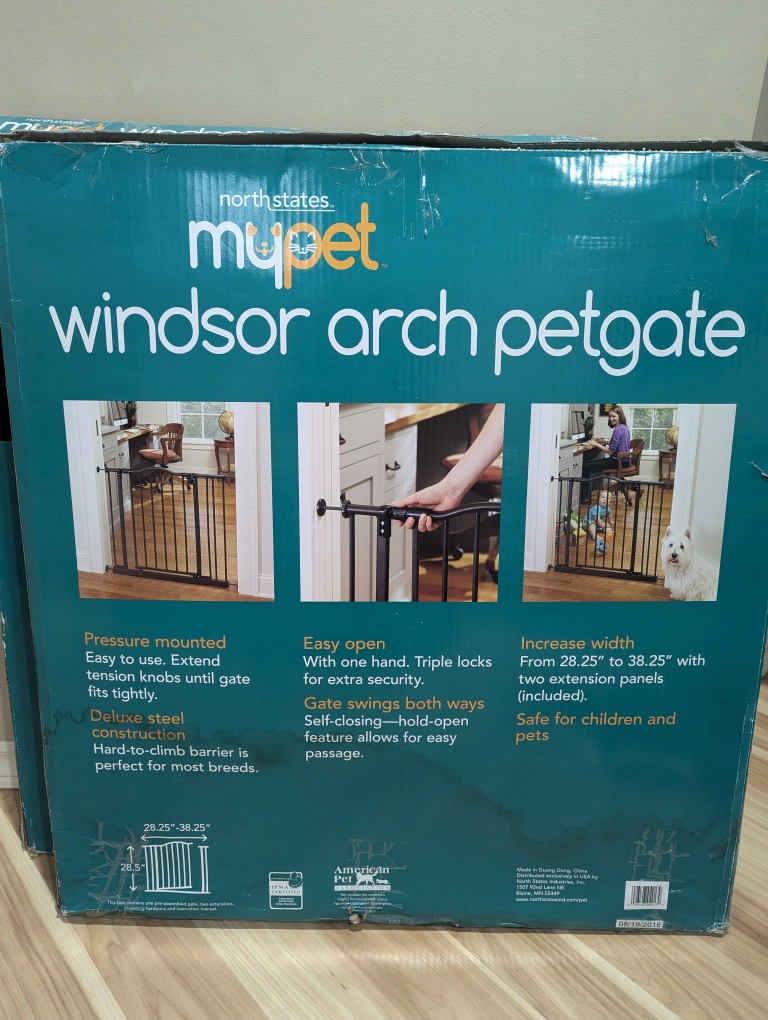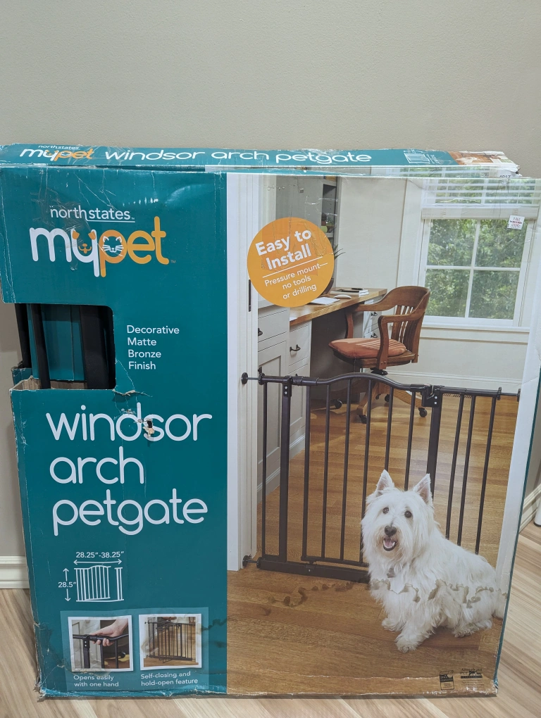 Pressure mounted petgate. Matte bronze finish. Easy to install. Self-closing, walk-through feature. Safe for children and pets.