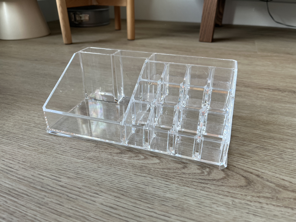 Clear plastic organizer used for organizing makeup and hygiene products. I’m giving this away because we moved and this doesn’t work for me anymore in the new space.