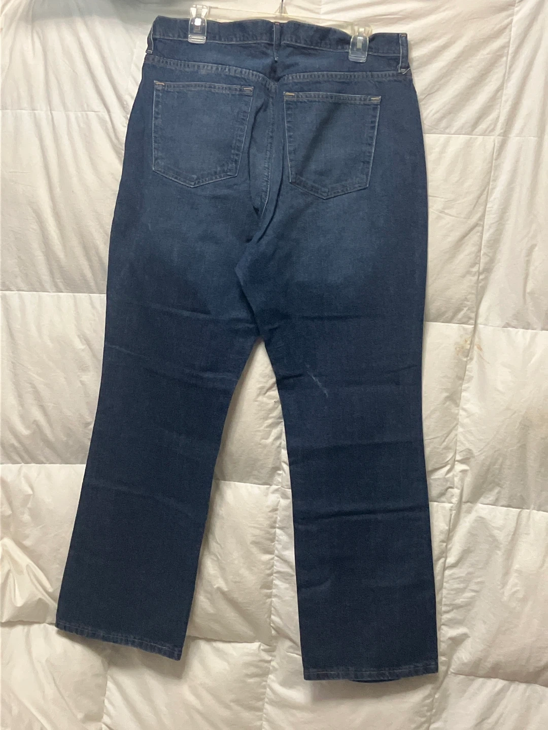 These are blue denim jeans by Cabella. They're a classic fit with a button and zip closure. Material is 100% cotton.