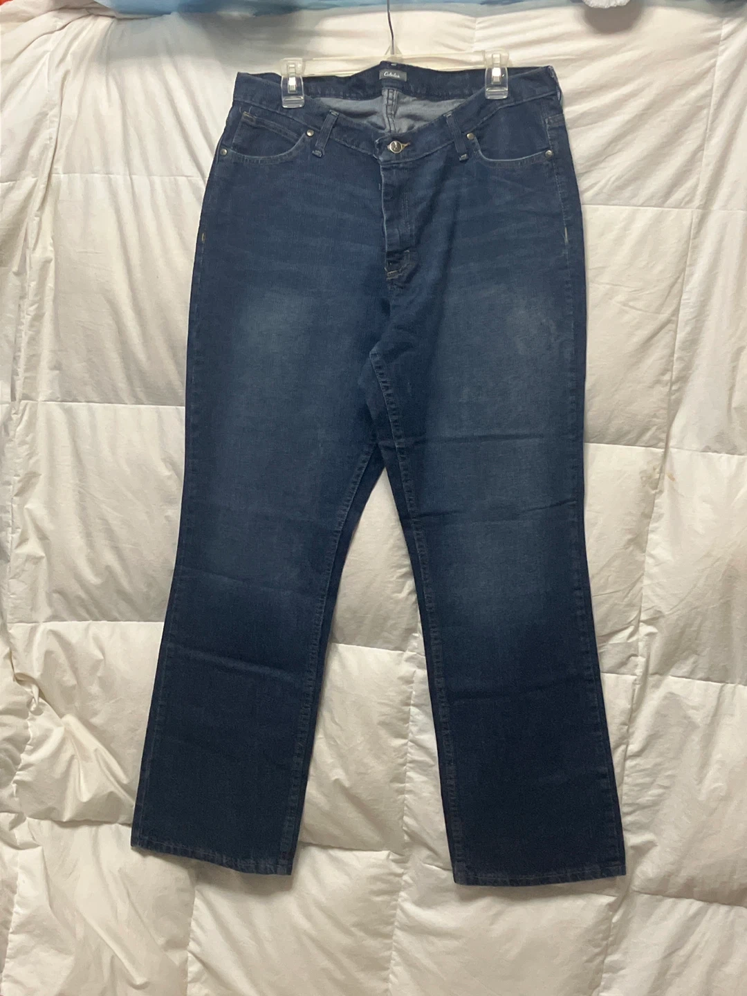 These are blue denim jeans by Cabella. They're a classic fit with a button and zip closure. Material is 100% cotton.