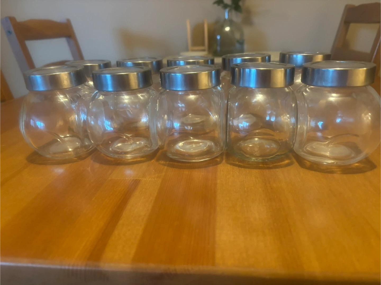 This set includes ten small glass jars, each with a silver-toned metal screw-on lid. They're perfect for storing spices, small craft supplies, or homemade jams. Jars are clear glass.