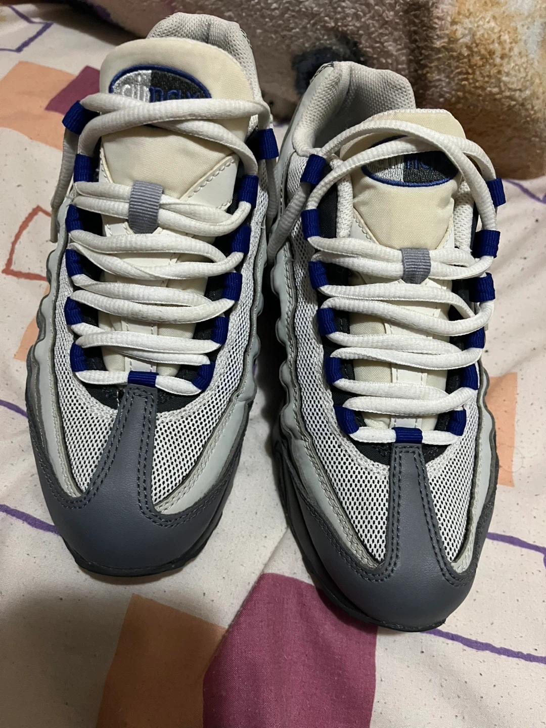 These Nike Air Max 95 sneakers come in a white, grey, and blue colorway. They feature a lace-up closure and the iconic Air Max cushioning system. These are great for casual wear or athletic activities.