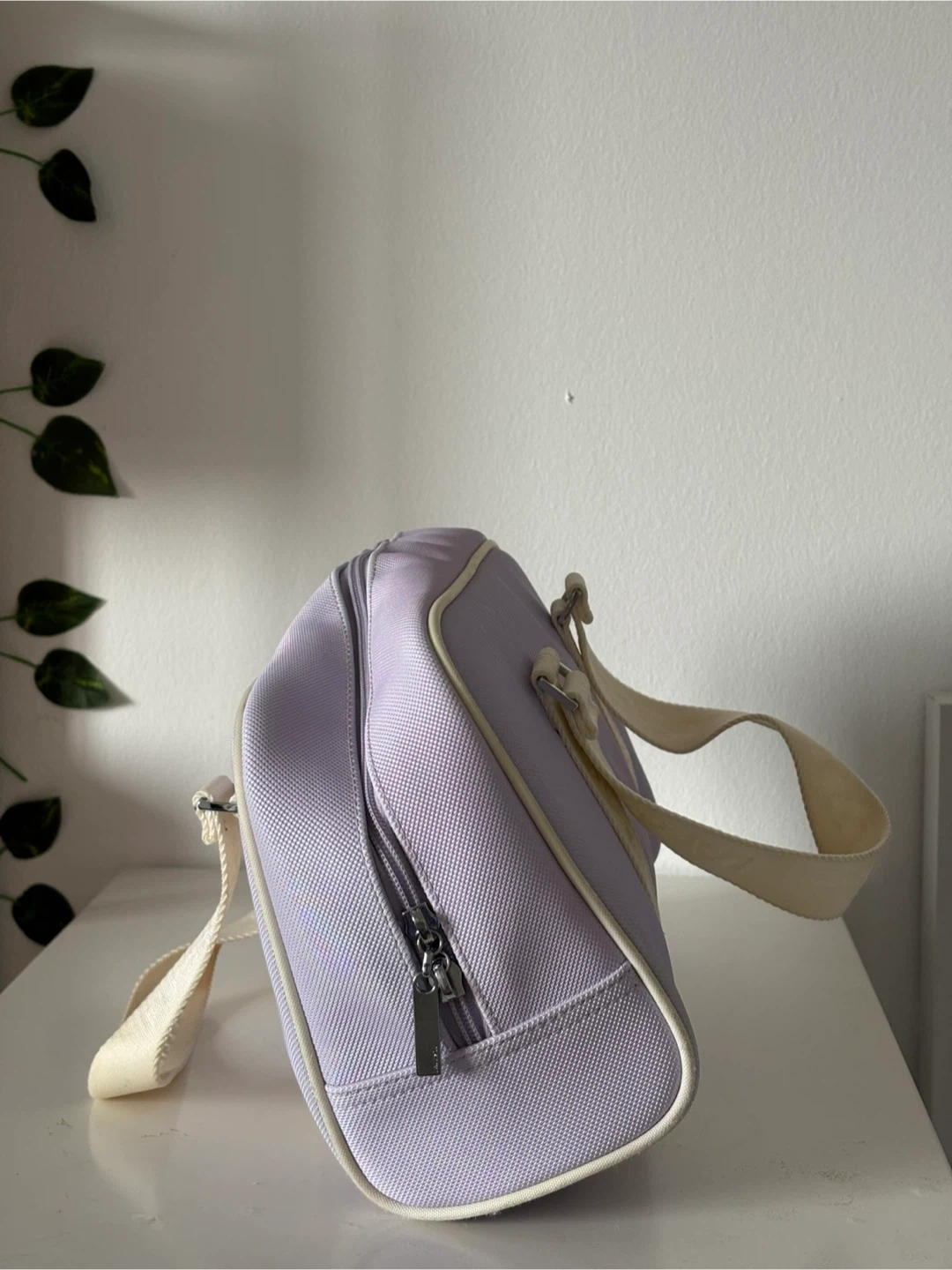 Lavender duffel bag with cream trim and handles. It has a zippered main compartment and a side zippered pocket. Durable, textured material.