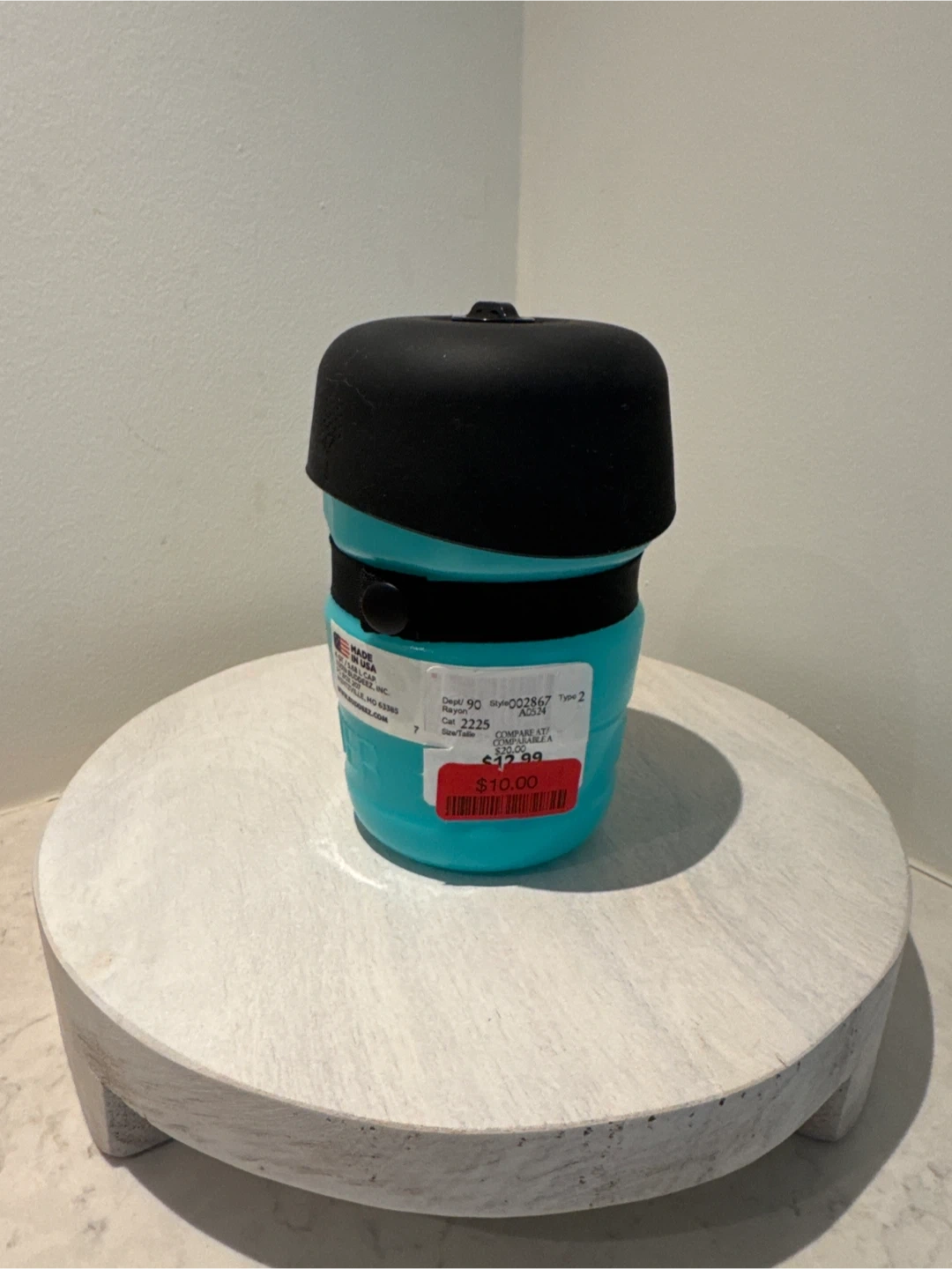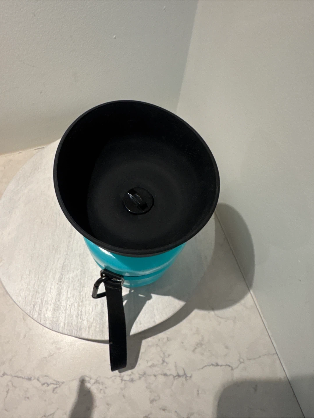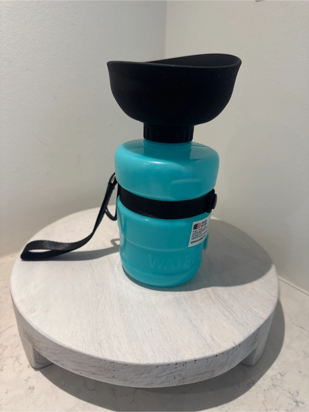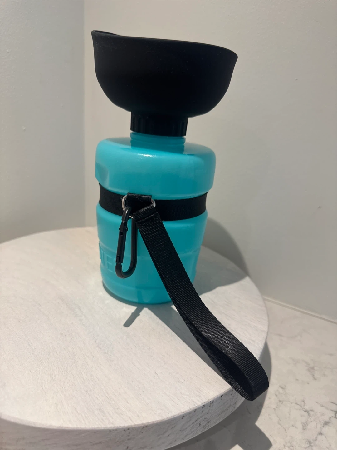 I have a brand new portable dog water bottle for sale! It's in an aqua colour with a black top and strap. It's perfect for walks or trips to the park to keep your furry friend hydrated