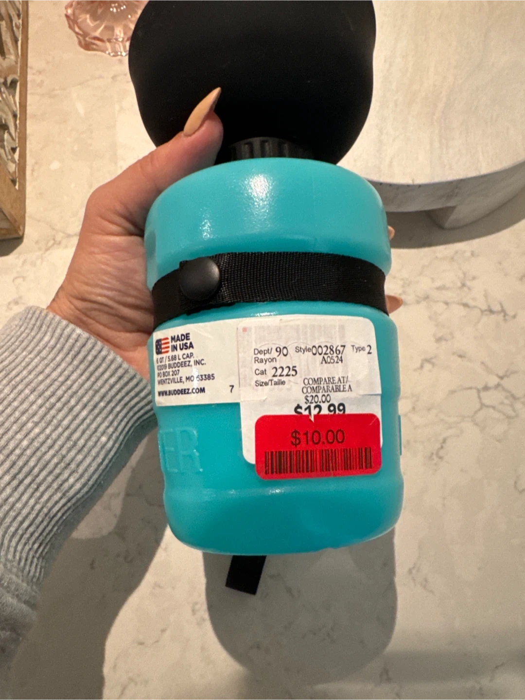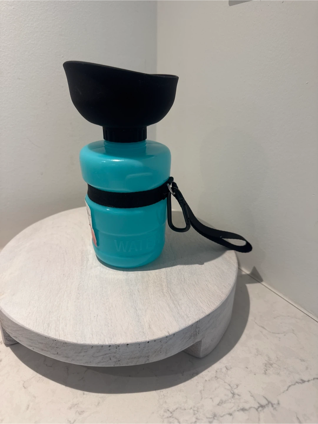 I have a brand new portable dog water bottle for sale! It's in an aqua colour with a black top and strap. It's perfect for walks or trips to the park to keep your furry friend hydrated