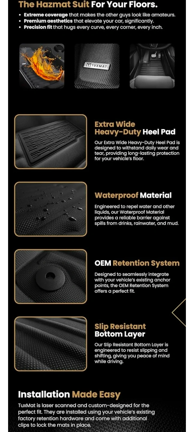 - All-Weather Protection: Shield your vehicle's interior against rain, snow, salt, mud, and spills.