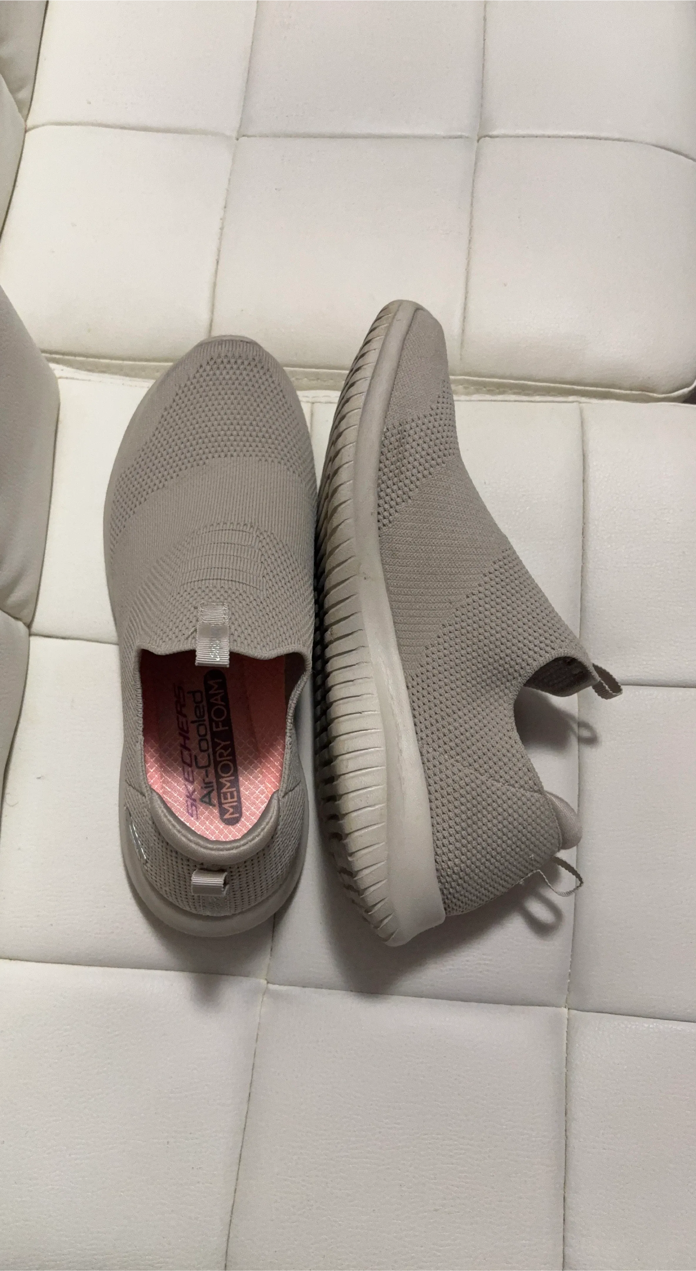 Selling a pair of beige Skechers slip-on shoes with Air-Cooled Memory Foam. They're in used condition and ready for a new owner!