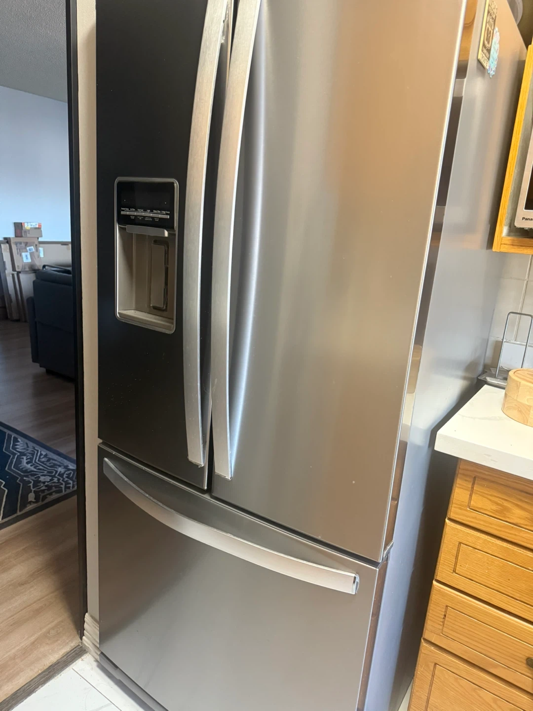 Stainless steel French door refrigerator with an external water dispenser. It features a bottom freezer drawer. This fridge offers ample storage space for groceries.