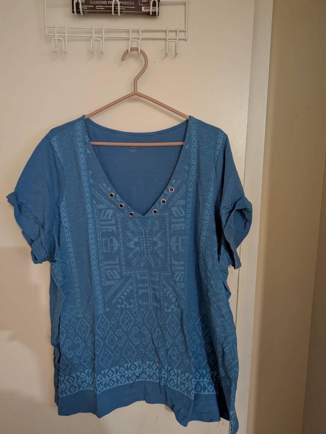 This blue V-neck top features an all-over embroidered geometric pattern. It has roll-tab sleeves and decorative eyelet details at the neckline. Made from a soft, breathable fabric for everyday wear.