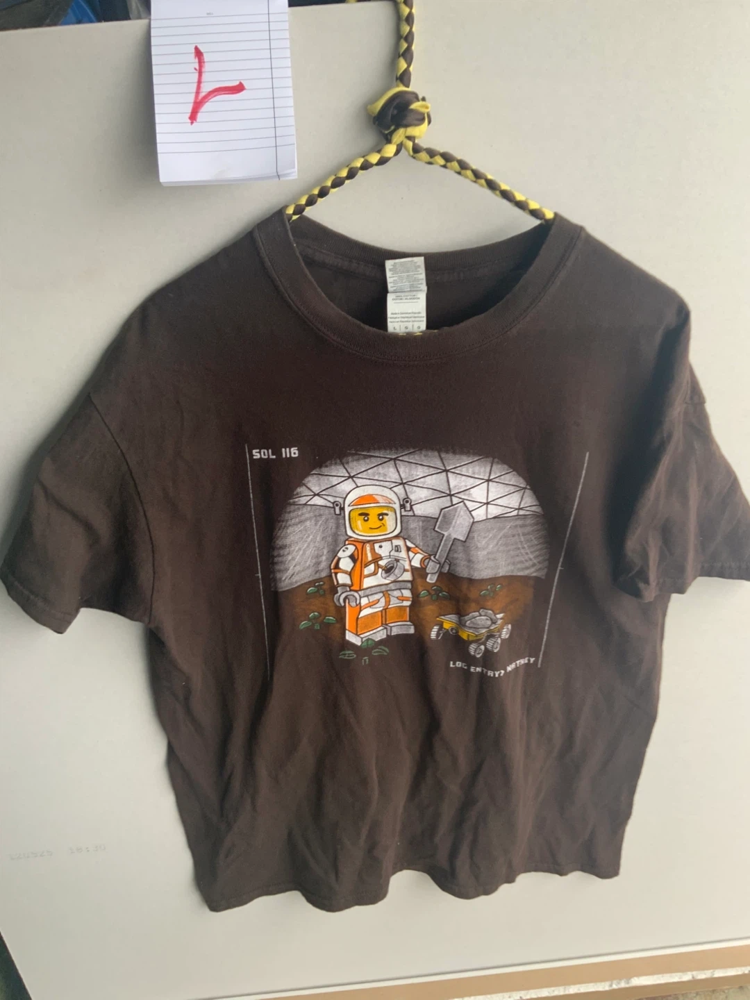 A brown t-shirt featuring a Lego astronaut graphic. The shirt is made of cotton and is size large. It has a fun graphic with text that reads 'SOL 116' and 'LOG ENTRY? THEY'.