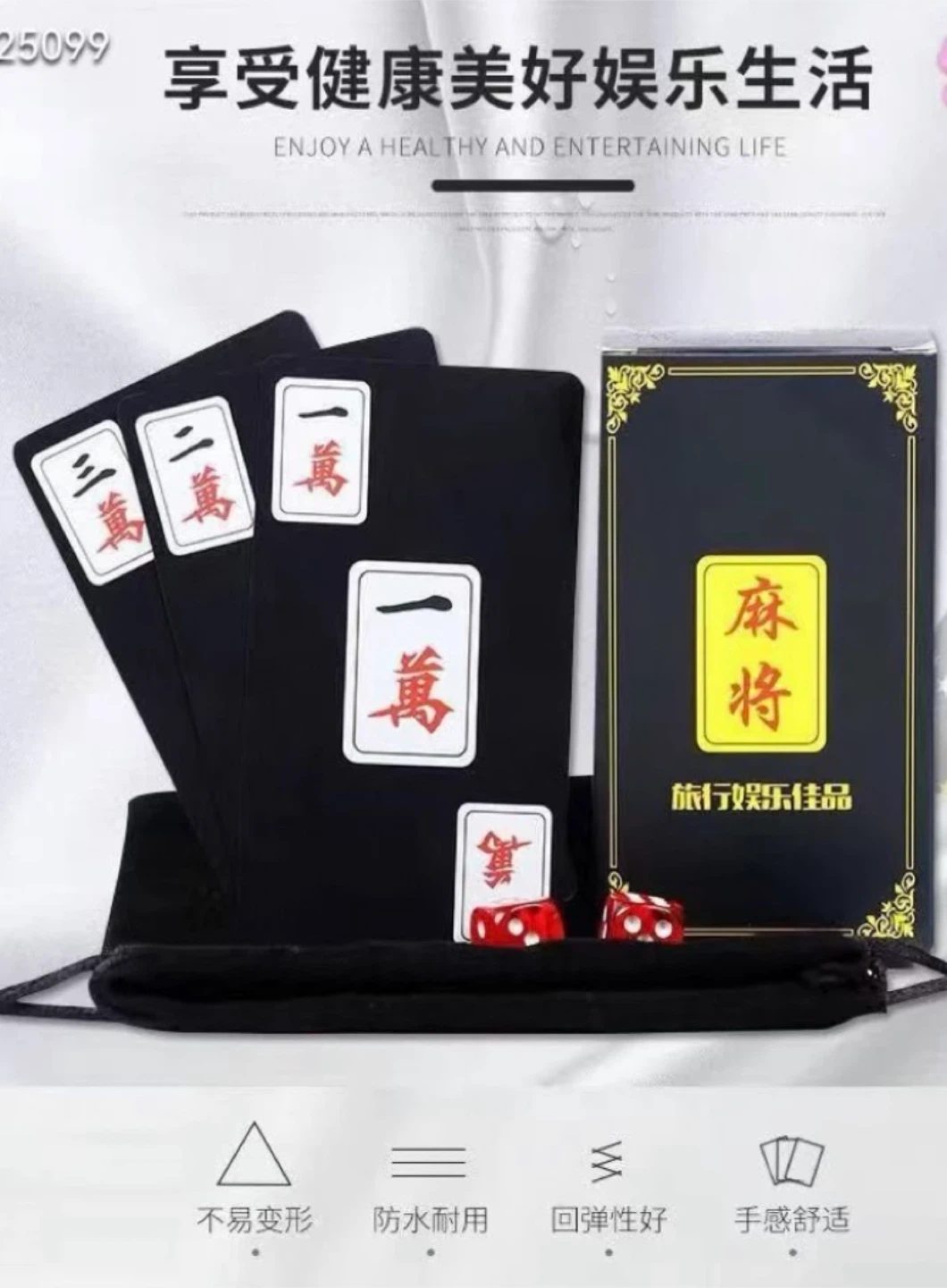 Portable mahjong card set for entertainment. Includes cards and dice. The cards are waterproof, durable, and have a good feel. Perfect for travel and leisure!