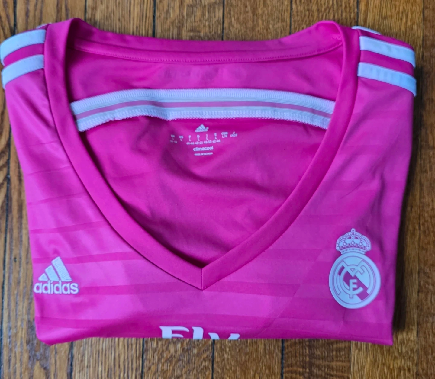 Selling an Adidas Real Madrid jersey in a vibrant pink color!