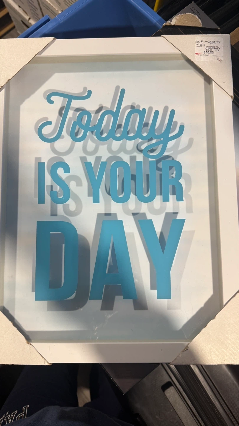 White framed wall art with blue "Today is Your Day" lettering. This piece is great for adding a motivational touch to any room. Dimensions are 17.5 inches by 13.5 inches.