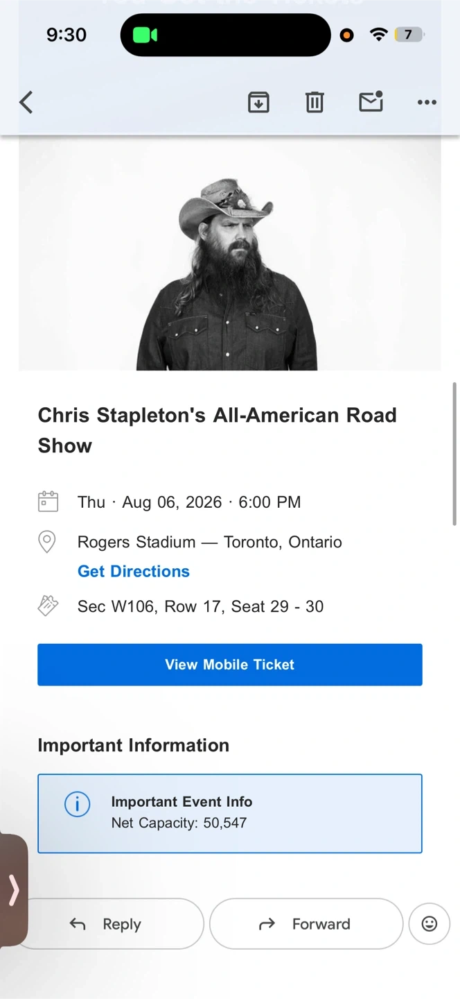 Selling two tickets to see Chris Stapleton's All-American Road Show at Rogers Stadium in Toronto on Thursday, August 6, 2026 at 6:00 PM