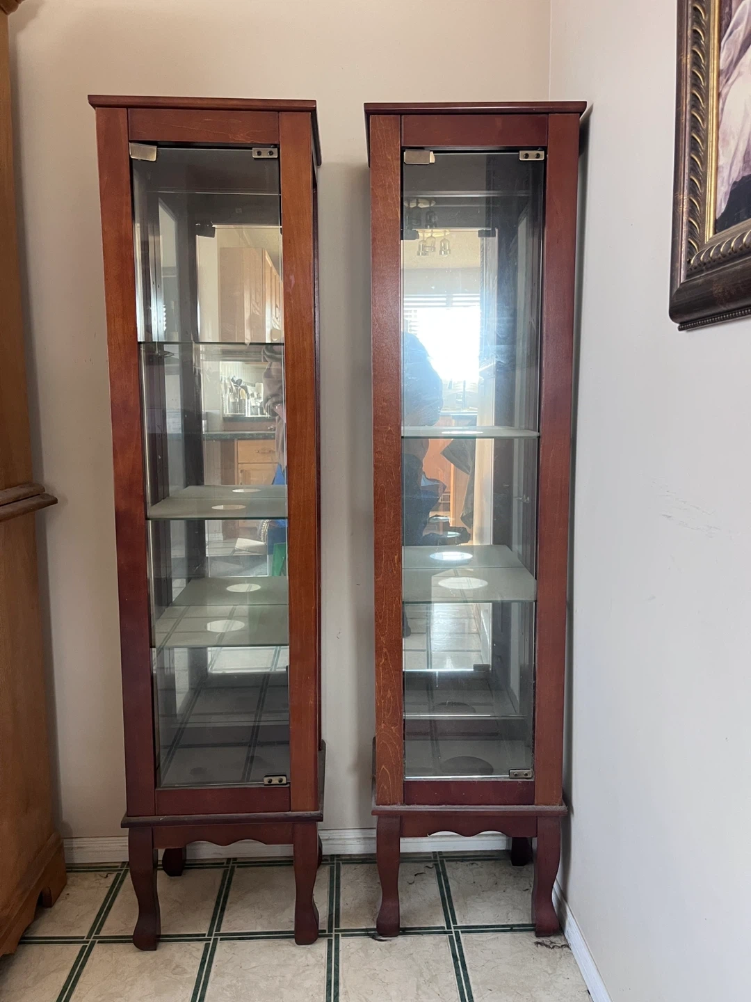 These are two tall wooden display cabinets with glass doors and multiple glass shelves. They have a rich wood finish and decorative legs. Perfect for showcasing collectibles or decorative items!