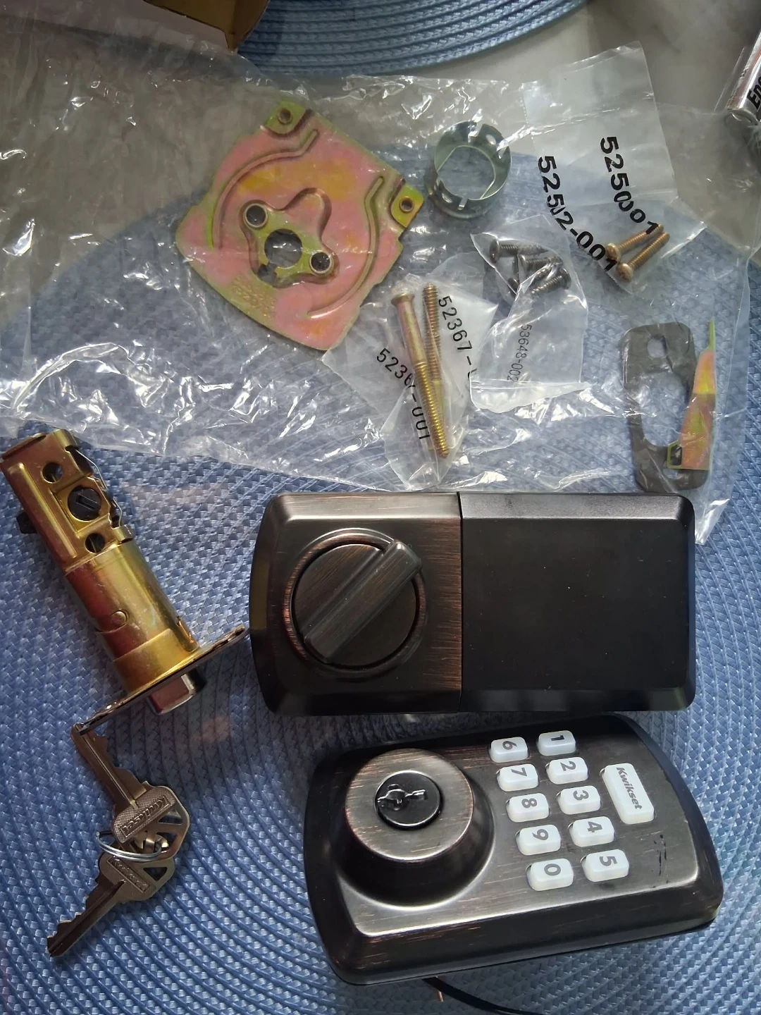 This is a Kwikset Powerbolt 250 keypad electronic lock in a Venetian Bronze finish. It includes the deadbolt, strike plate, and two keys. Installation and user guide are provided. Requires 4 AA alkaline batteries (not included).