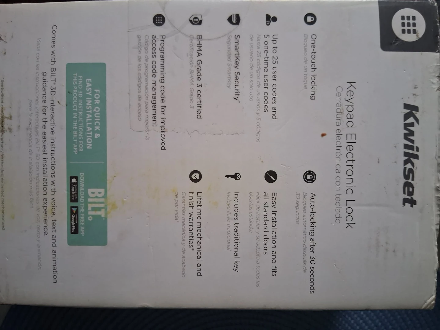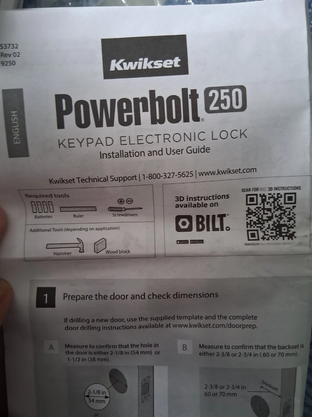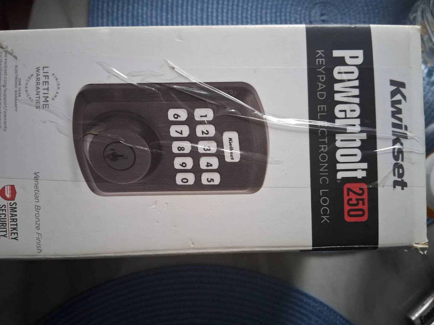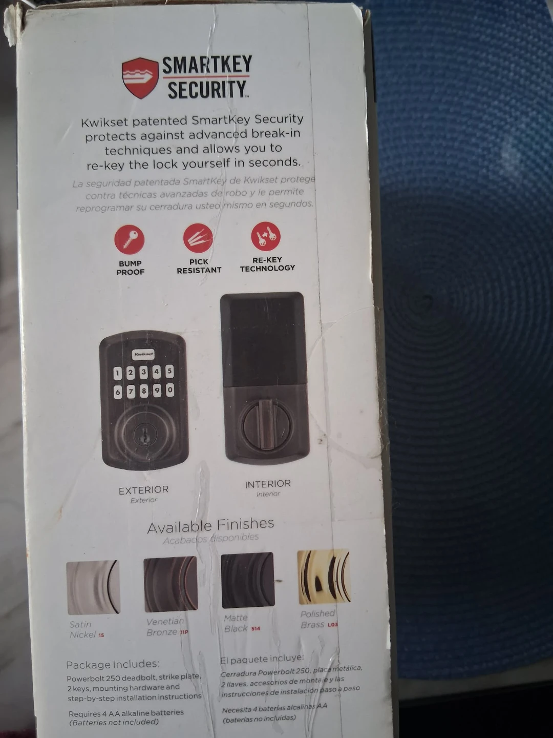 This is a Kwikset Powerbolt 250 keypad electronic lock in a Venetian Bronze finish. It includes the deadbolt, strike plate, and two keys. Installation and user guide are provided. Requires 4 AA alkaline batteries (not included).