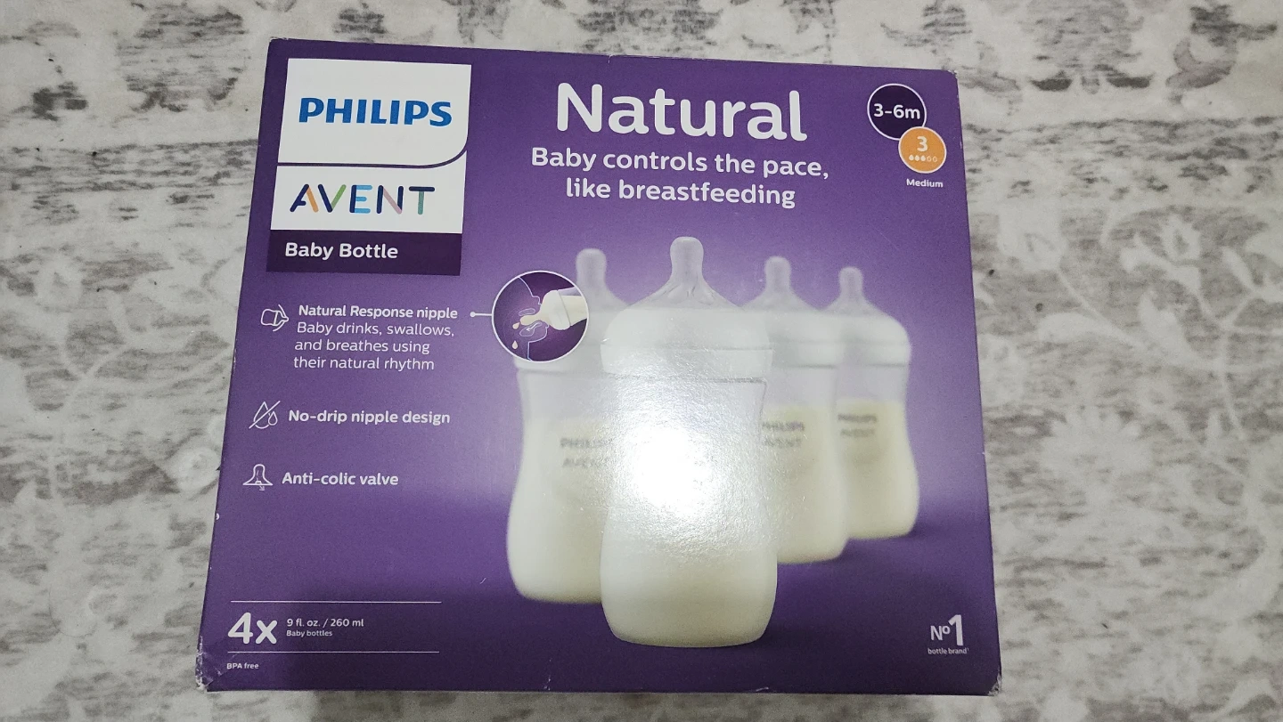 This is a set of 4 Philips Avent Natural baby bottles, each holding 260ml. They feature a natural response nipple, no-drip design, and an anti-colic valve. These bottles are BPA free and recommended for babies aged 3-6 months.