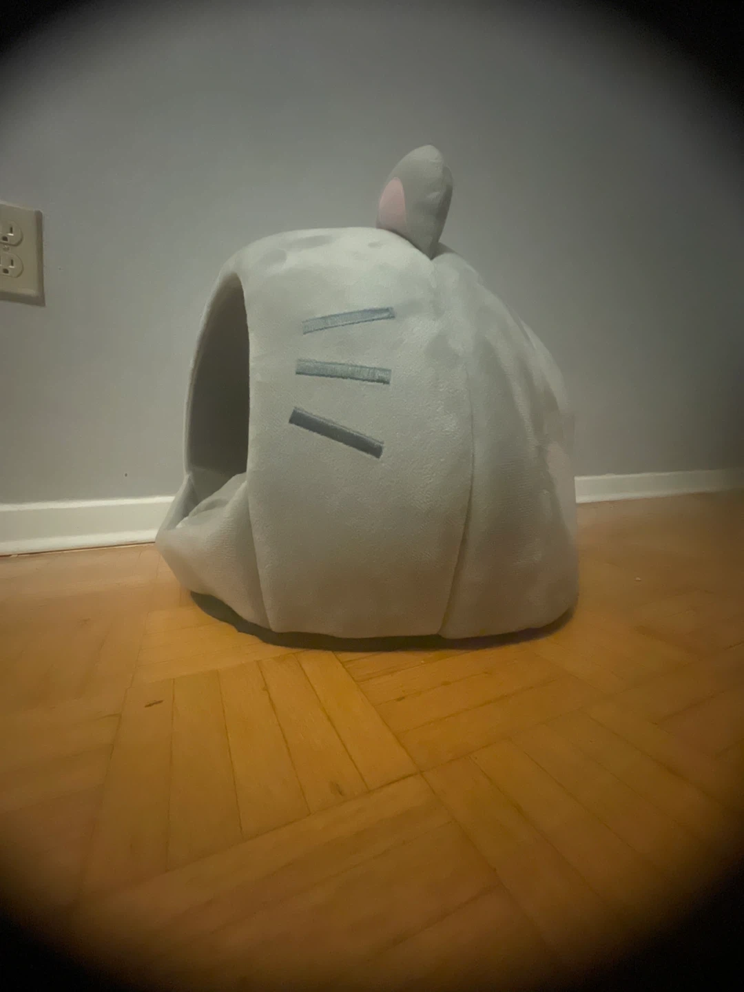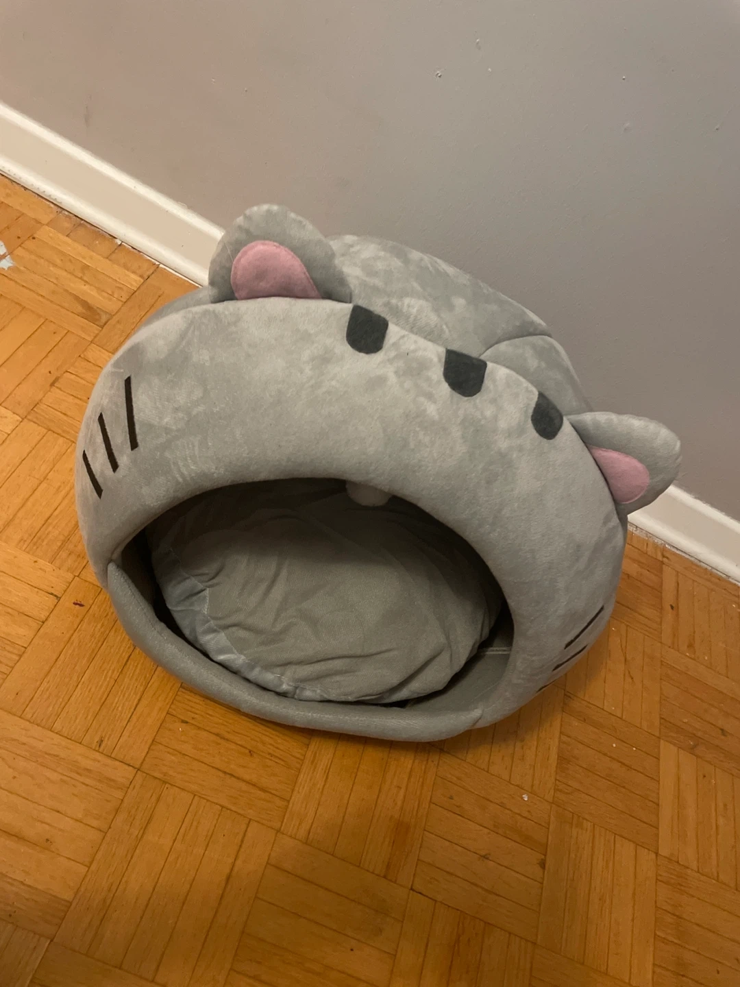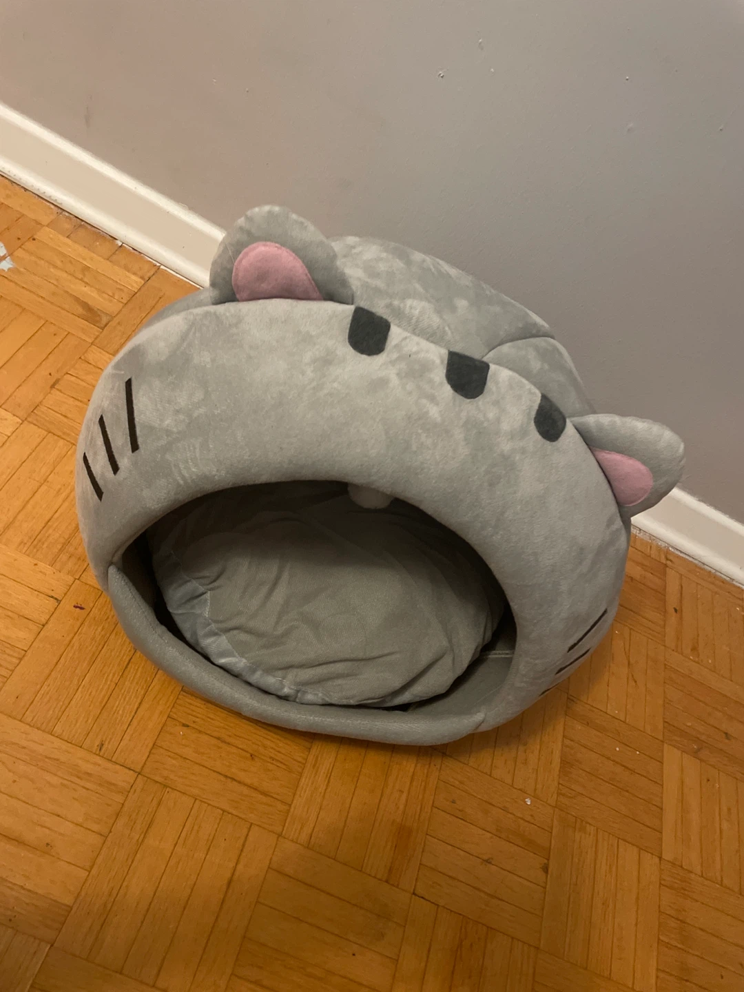 Super soft grey pet bed shaped like a cute cat's face. It's enclosed for extra coziness and has a removable cushion inside. Your kitten will love snoozing in this!