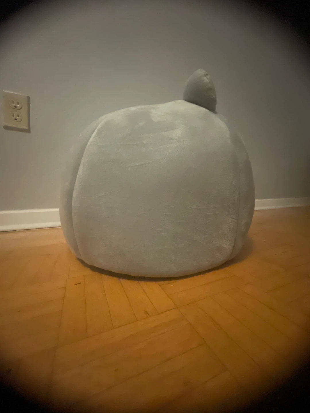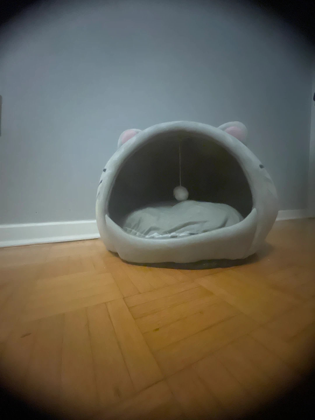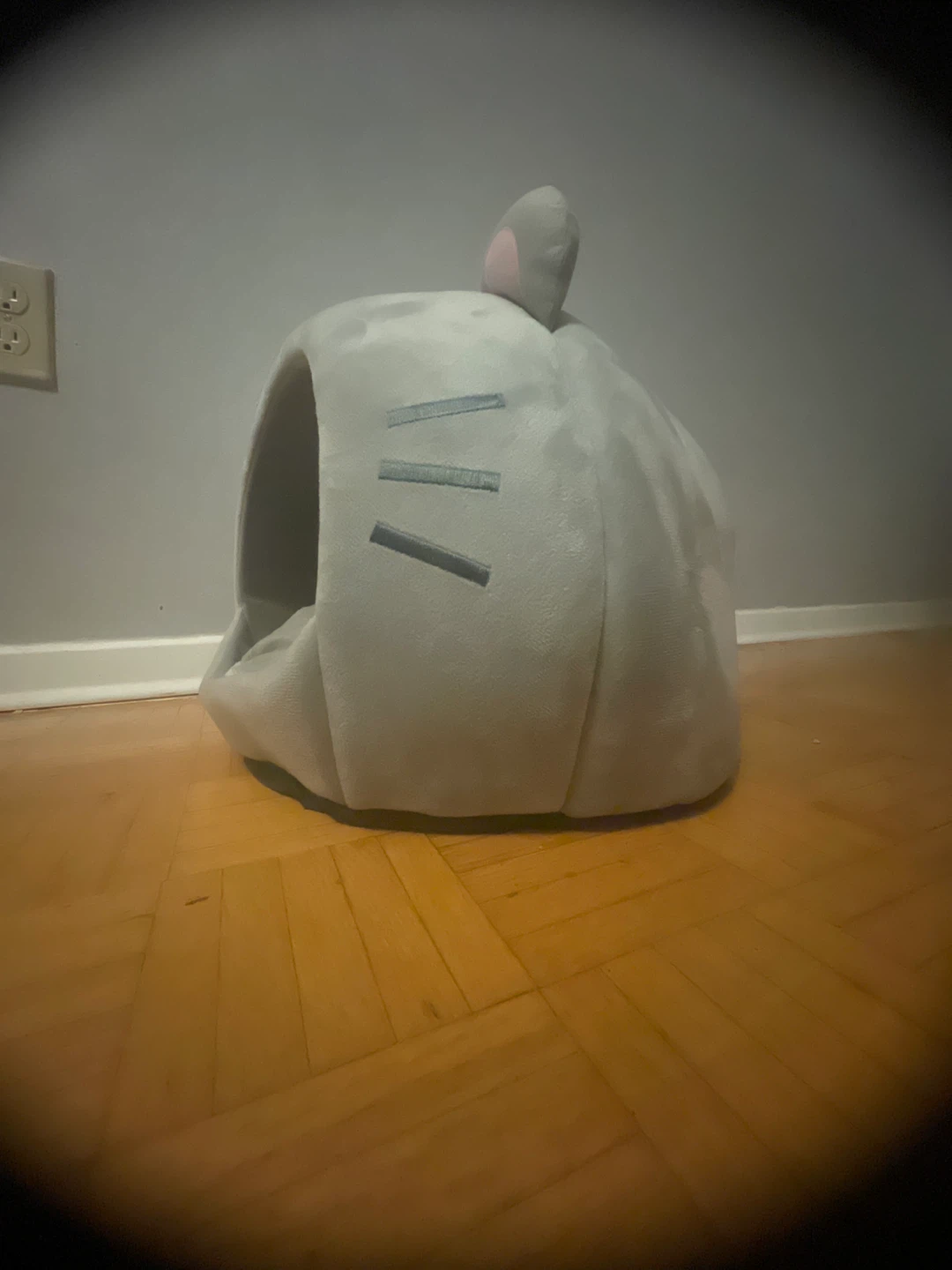 Super soft grey pet bed shaped like a cute cat's face. It's enclosed for extra coziness and has a removable cushion inside. Your kitten will love snoozing in this!