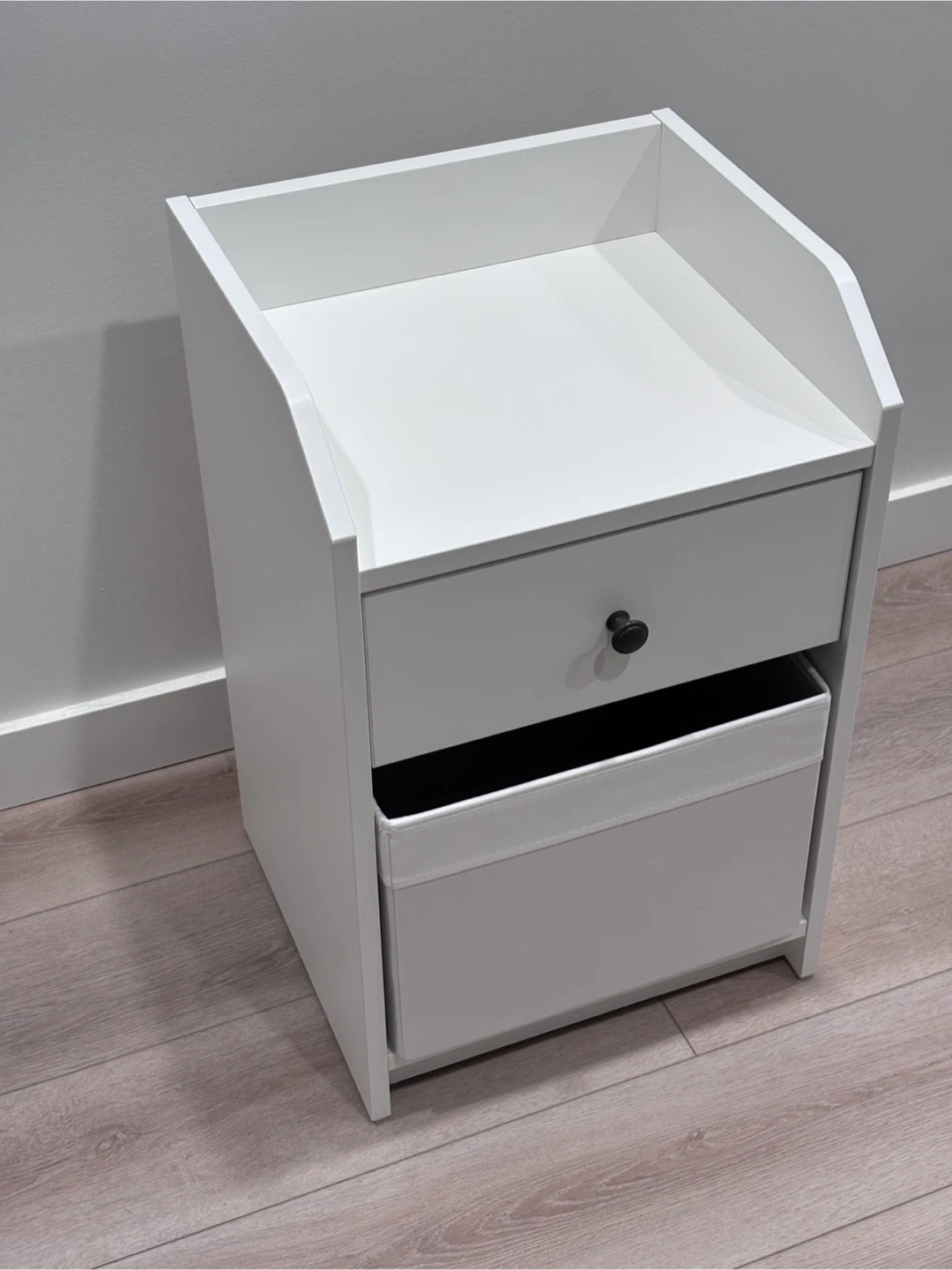 Two white nightstand featuring a single drawer and an open shelf with a fabric storage bin.