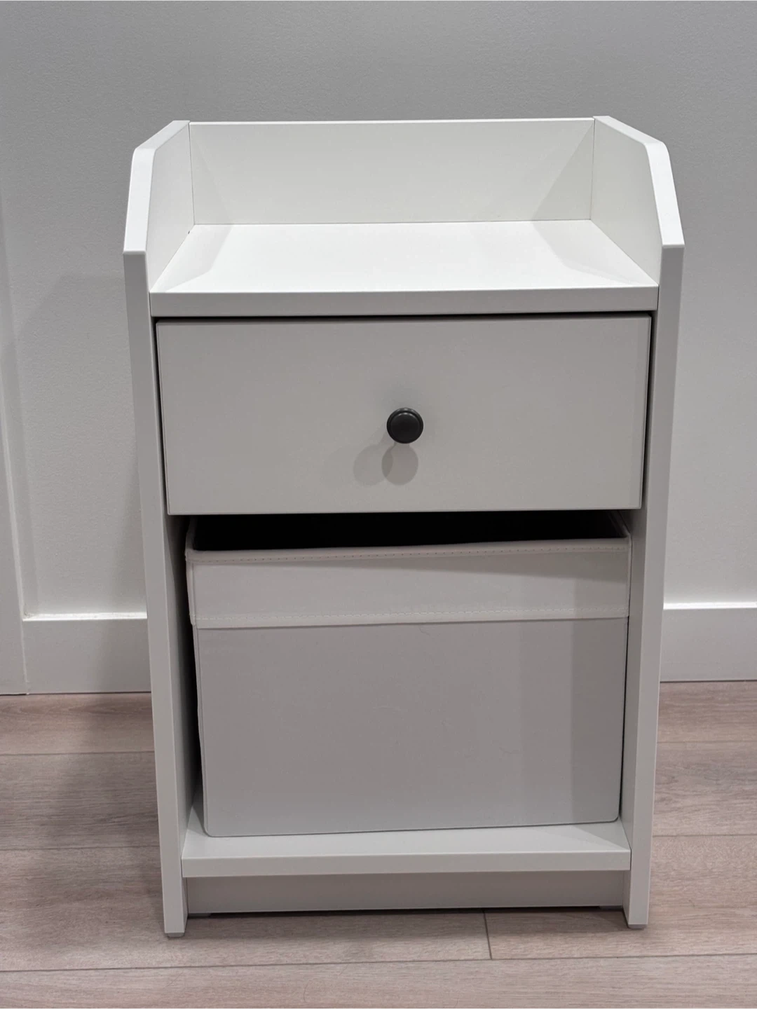 Two white nightstand featuring a single drawer and an open shelf with a fabric storage bin.