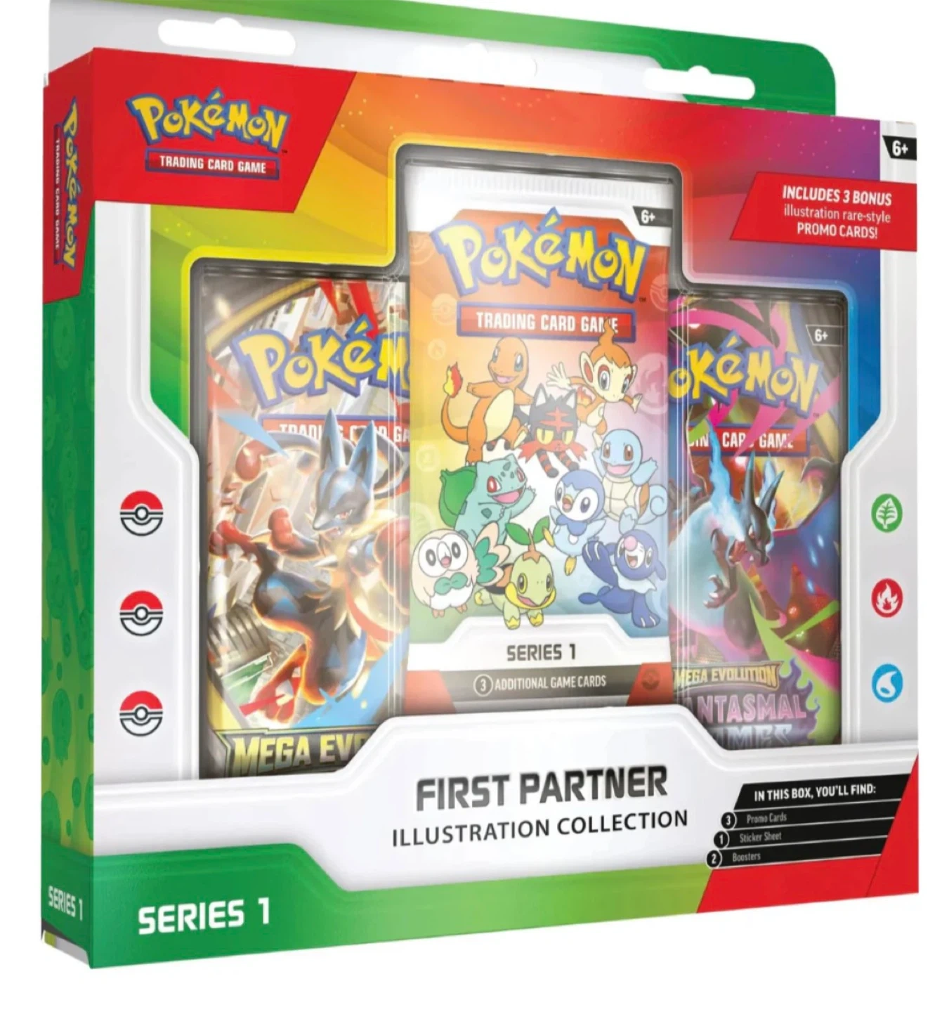 This Pokémon TCG First Partner Illustration Collection includes 3 bonus illustration rare-style promo cards, a sticker sheet, and 2 boosters. It's recommended for ages 6+.