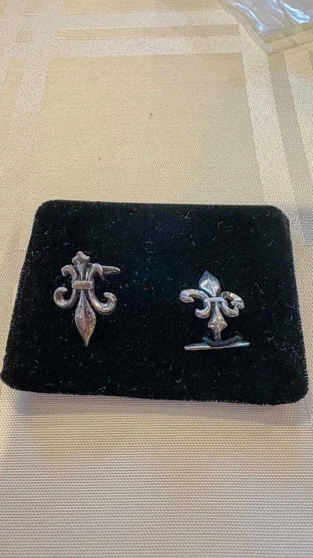 These are a set of pre-owned cufflinks featuring a Fleur-de-lis design, perfect for adding a touch of sophistication to any outfit. Although these cufflinks have been previously worn, they remain in good condition and ready to be worn again. If you see this advertisement, the cufflinks are still up for grabs!