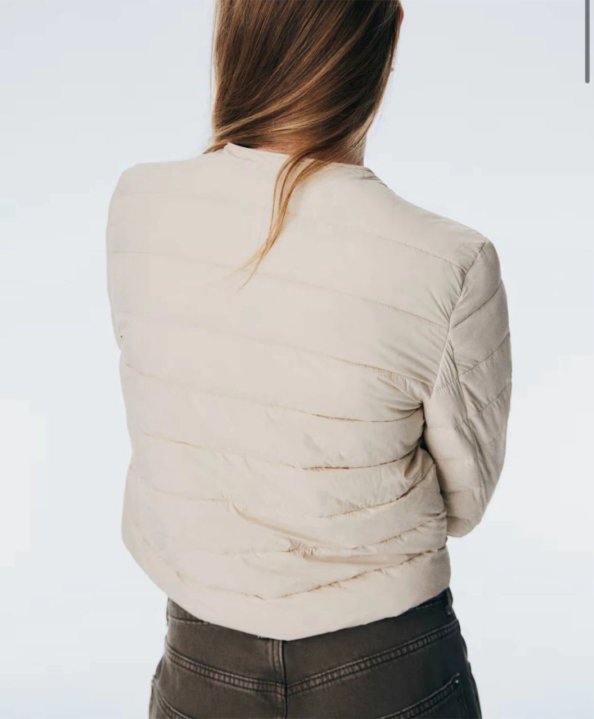 Lightly padded jacket in quilted nylon. Round neckline, snap fasteners at front, and discreet side pockets. Narrow elastic at cuffs. Lined.