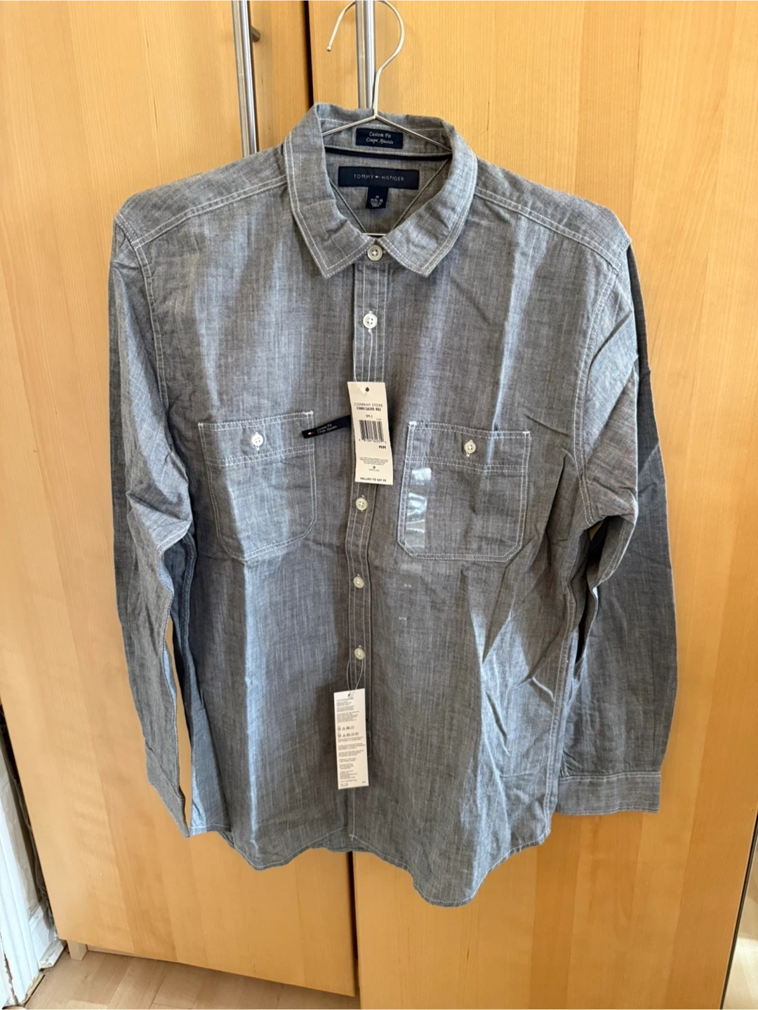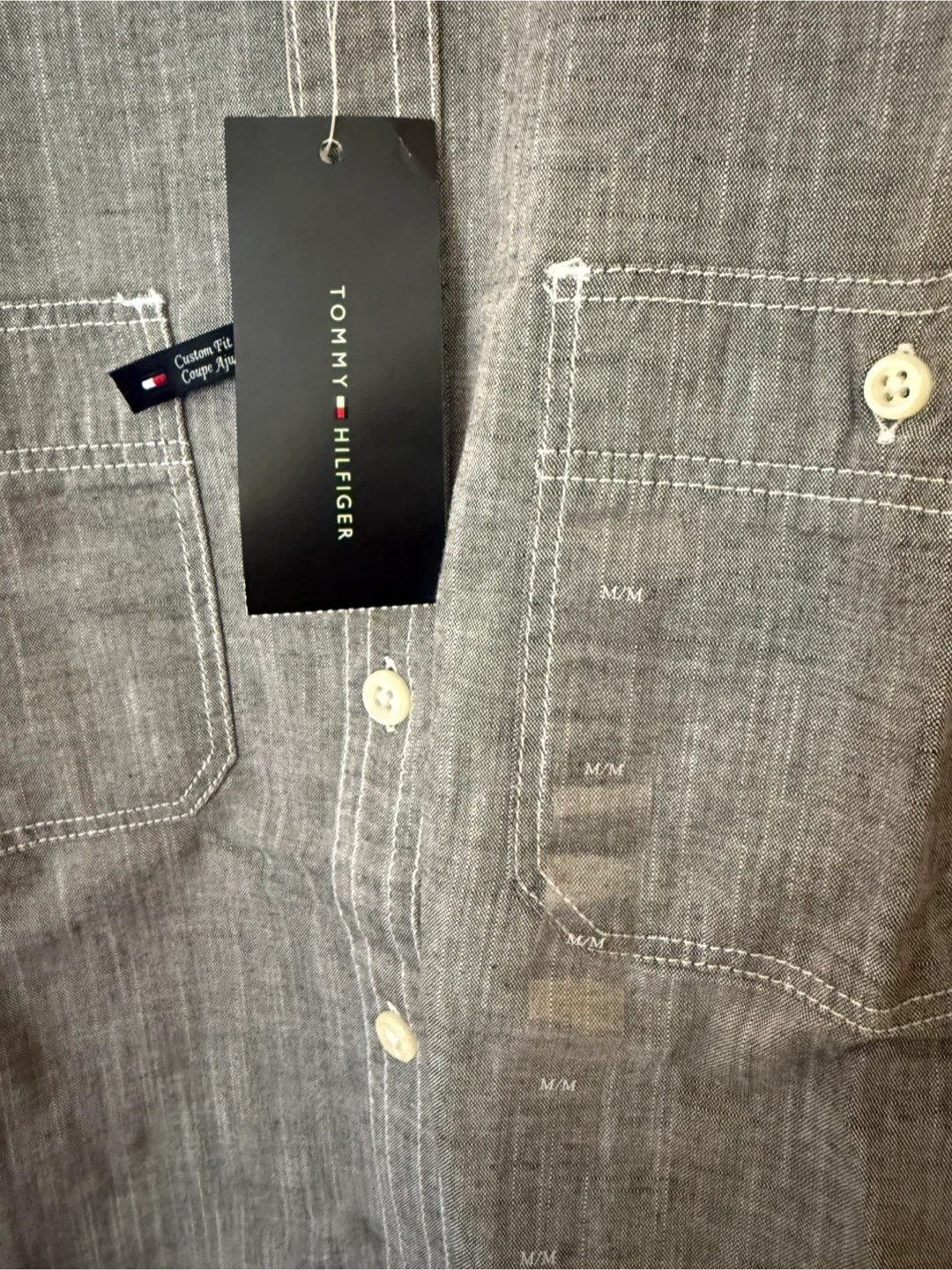 New Tommy Hilfiger custom fit long sleeve button-up shirt. It's grey with a textured weave and white contrast stitching. Features two chest pockets.