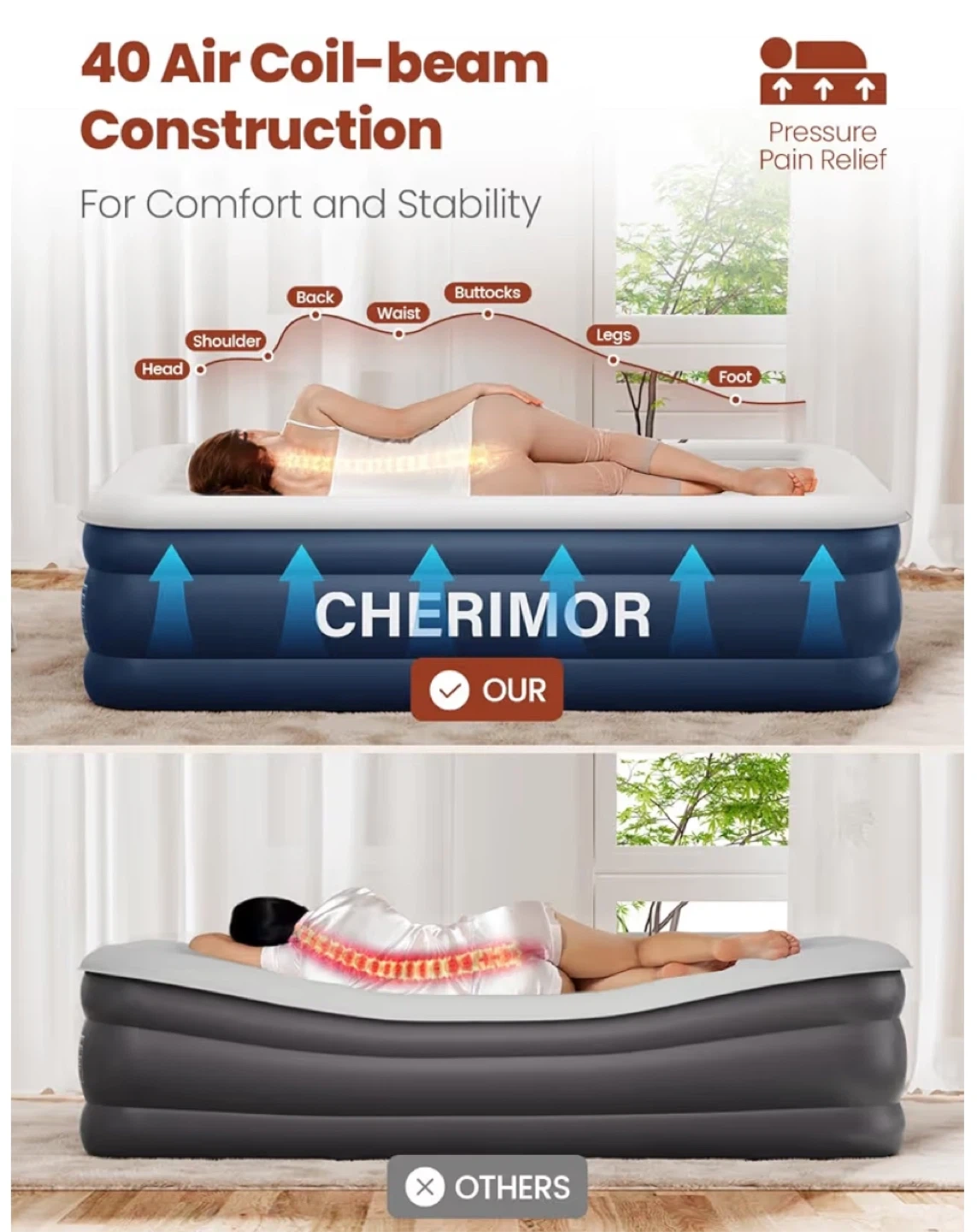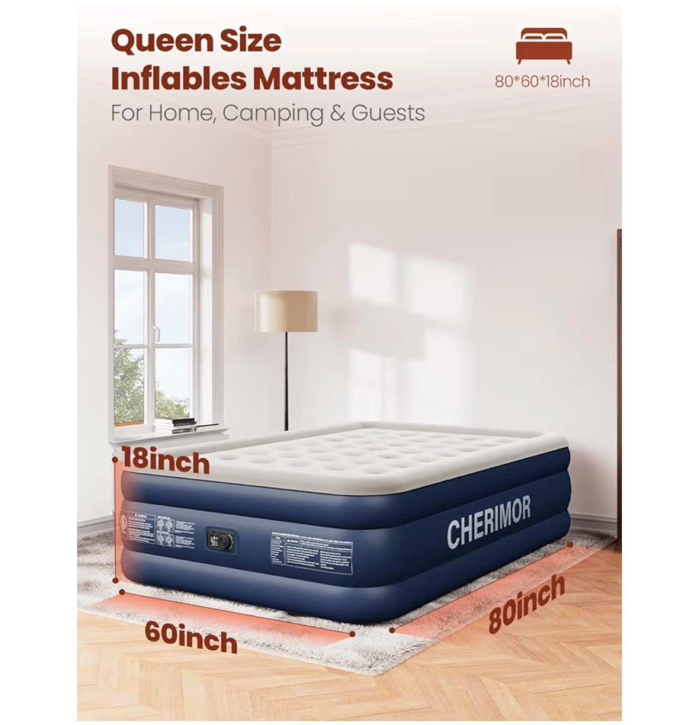 This queen-sized inflatable mattress is designed for home, camping, or guest use. It features 40 air coil-beam construction for comfort and stability. Includes a carry bag for portability.