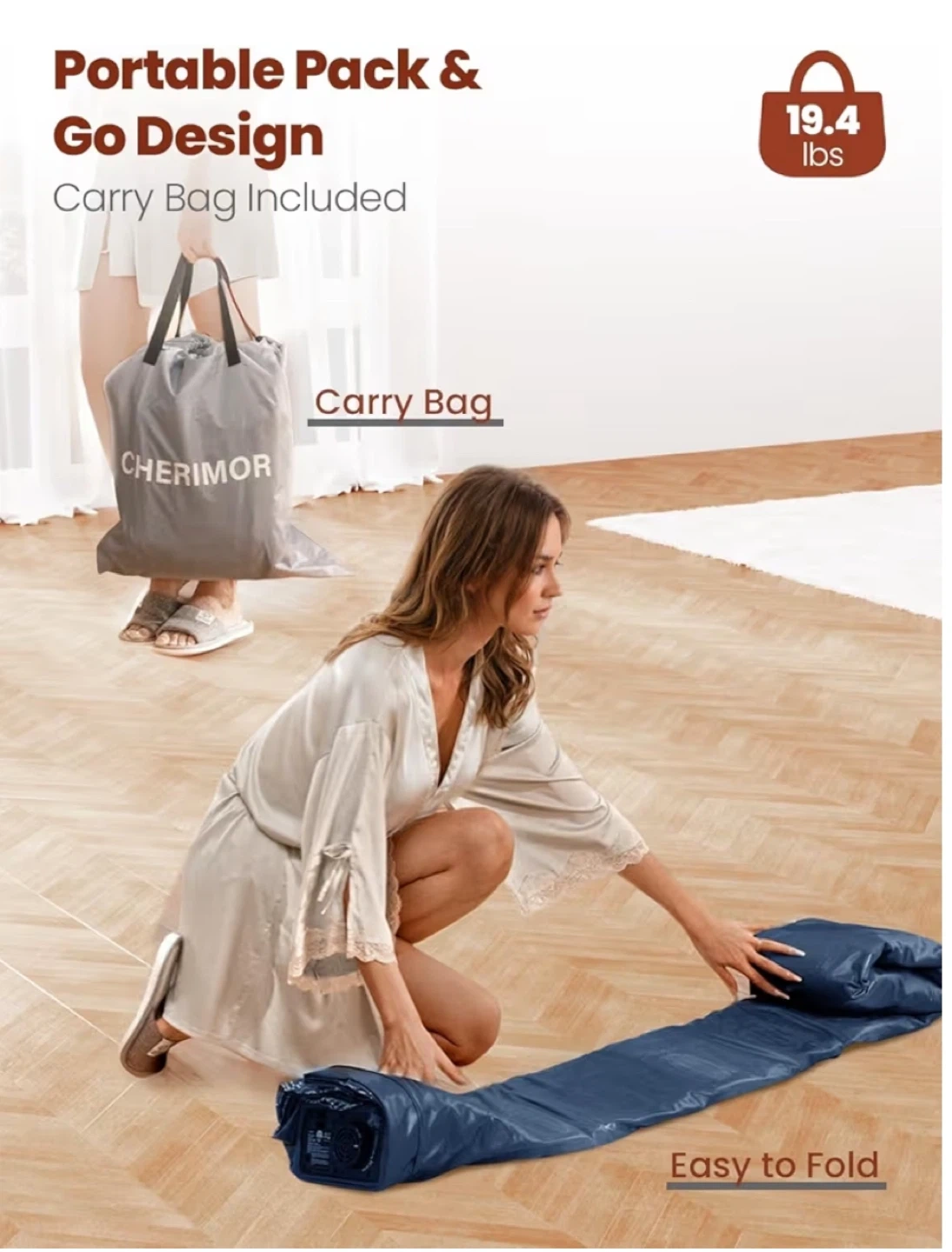 This queen-sized inflatable mattress is designed for home, camping, or guest use. It features 40 air coil-beam construction for comfort and stability. Includes a carry bag for portability.