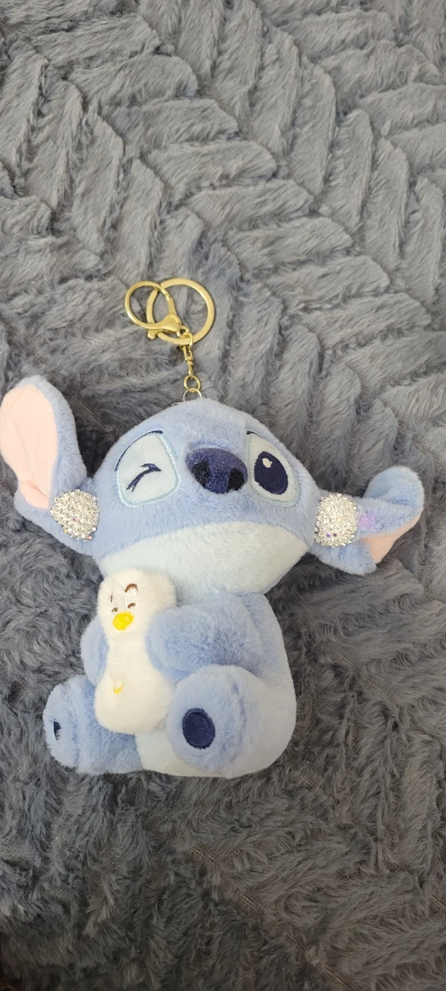 Super cute Stitch plush keychain! The plush is light blue and holding a little white duck. It has sparkly embellishments on the ears. Perfect for adding a touch of Disney magic to your keys or bag