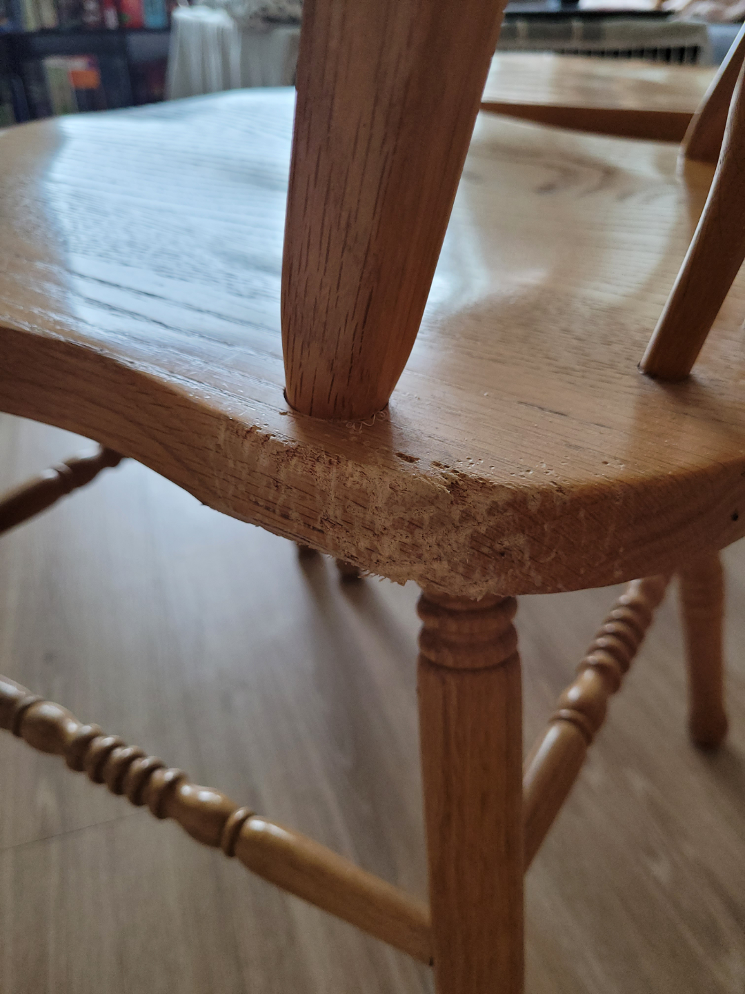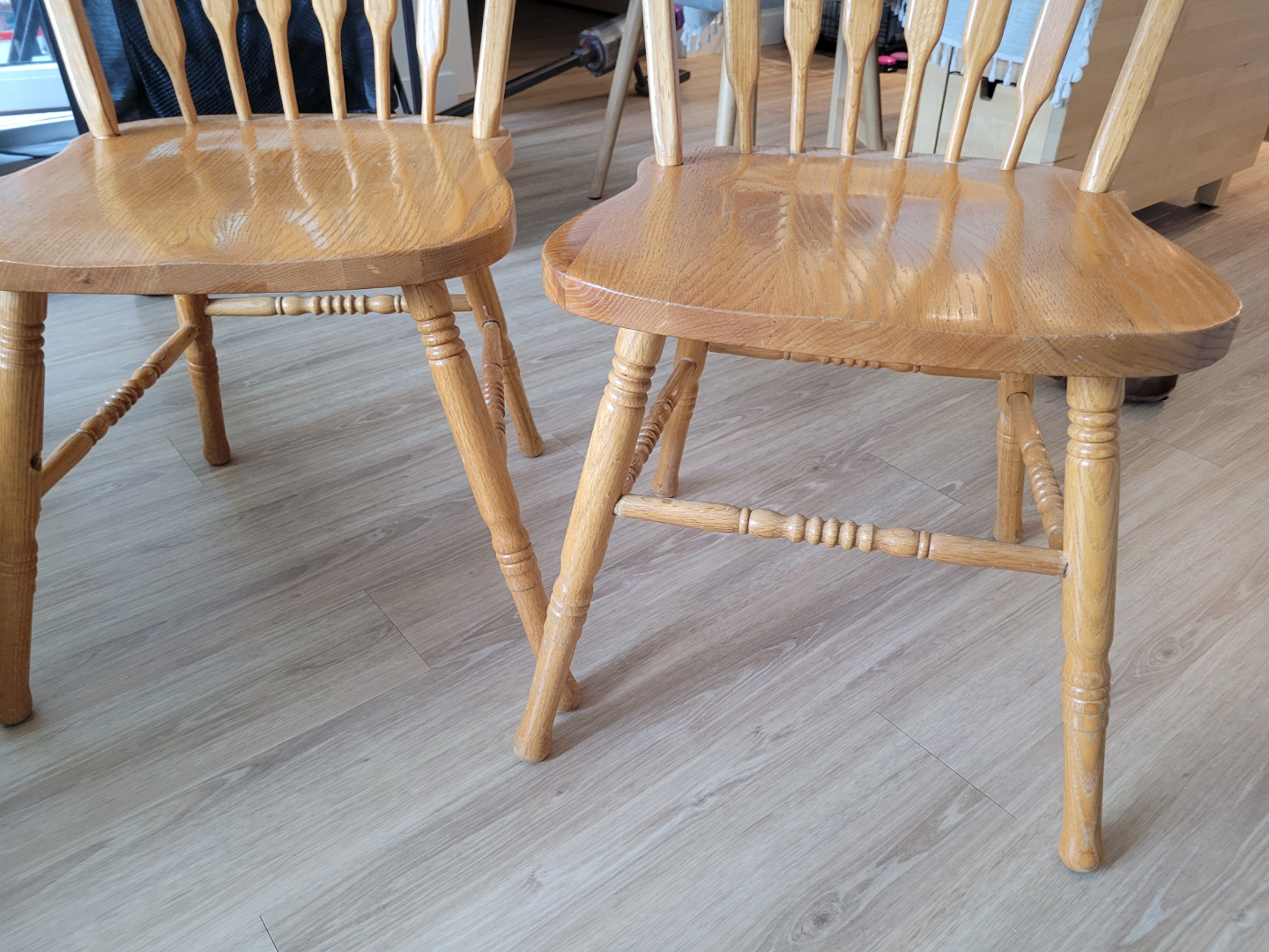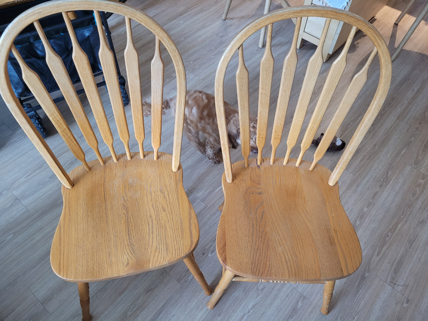 Two wood chairs. Light oak finish. both are a wobbly - need some work to make them sturdy again.