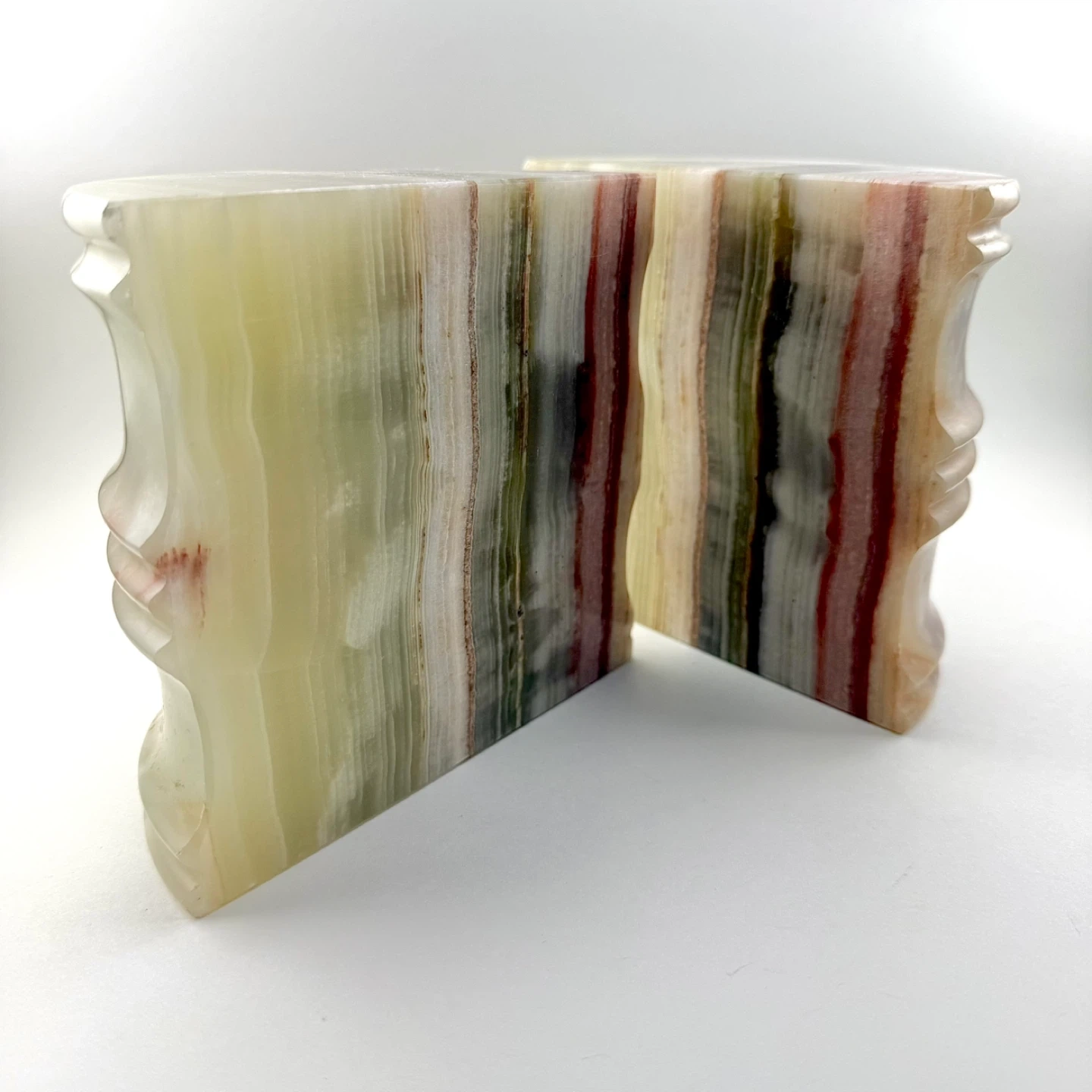 Pair of vintage large banded onyx bookends. One perfect, one has chip at top edge (see photo) but could be position out of view. They each measure 6” wide x 3” deep x 5.5” tall — very heavy