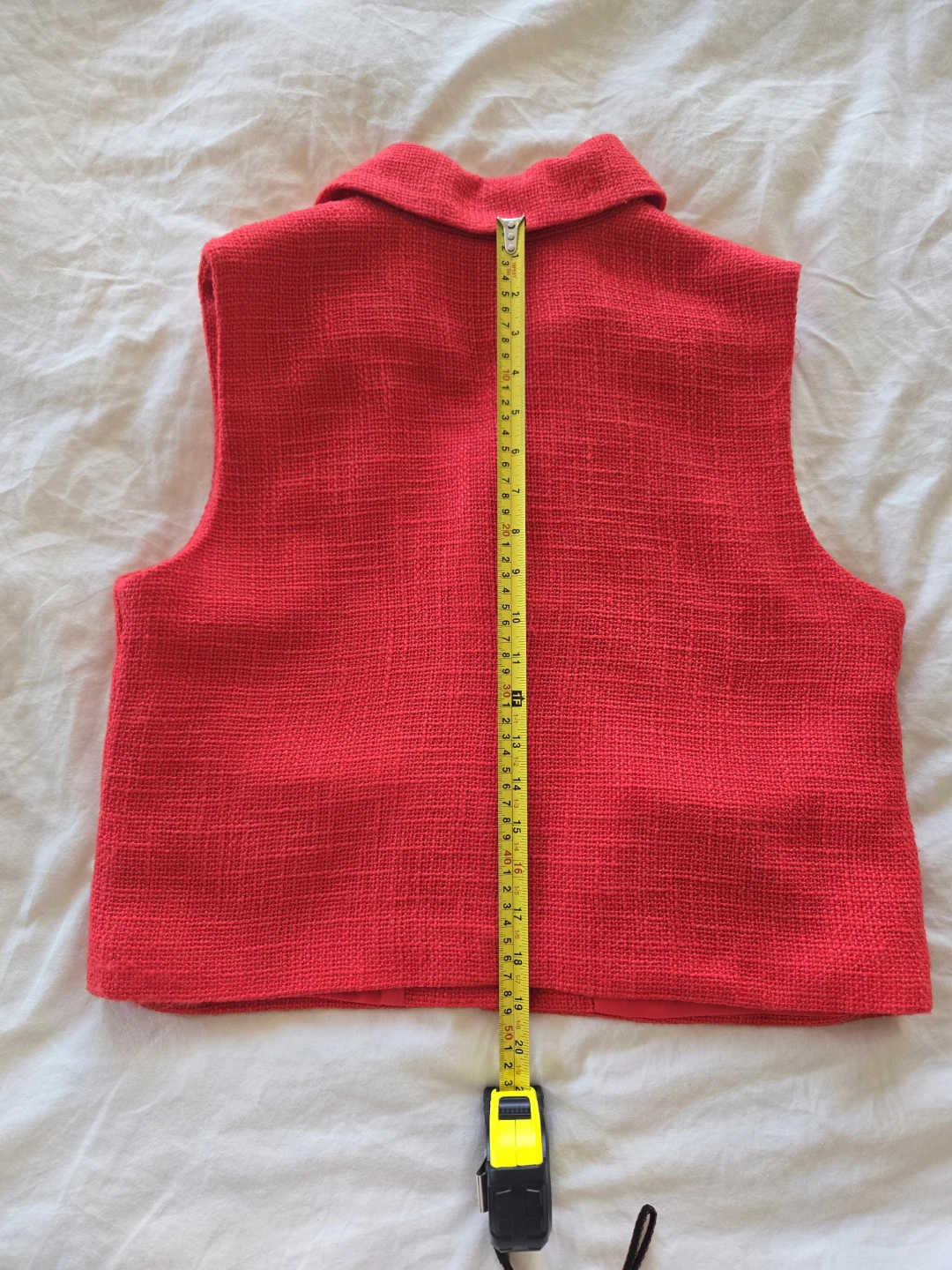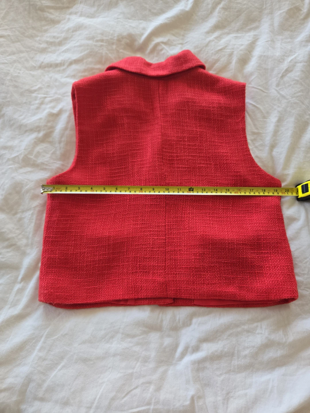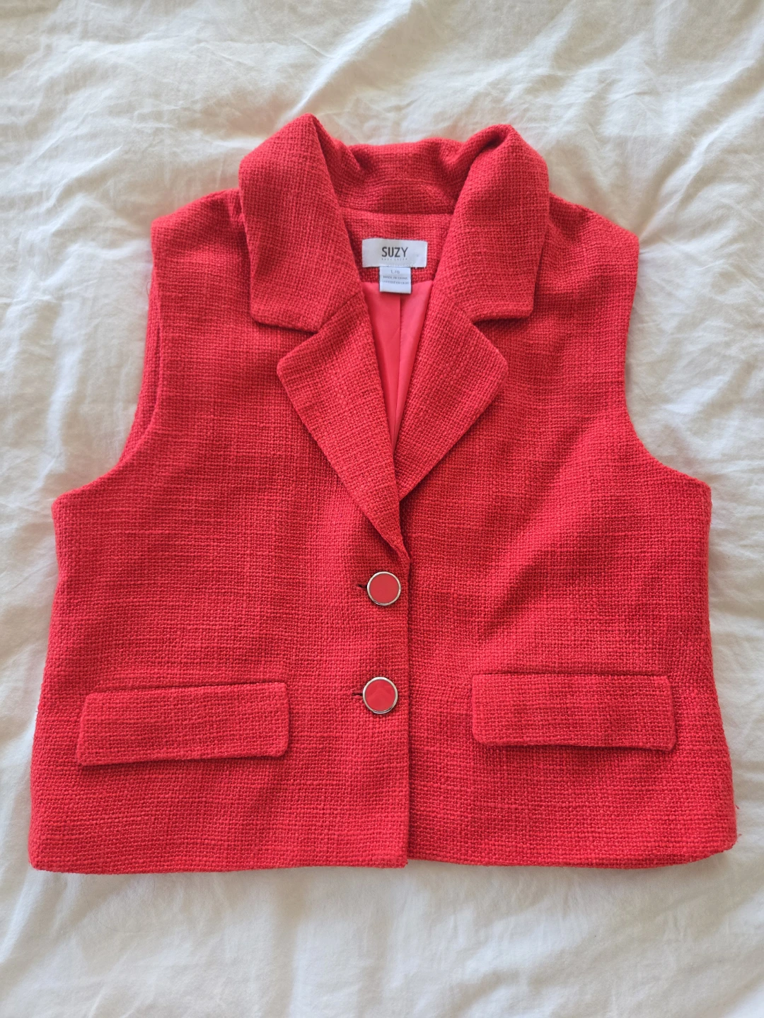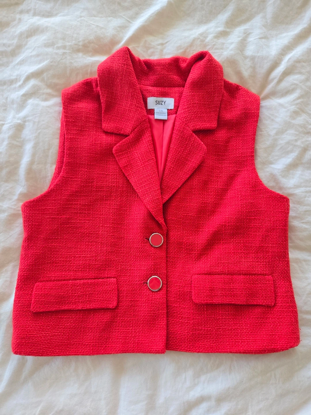 A vibrant red tweed vest from Suzy Shier. It features a collared neckline with two button closures and flap pockets.