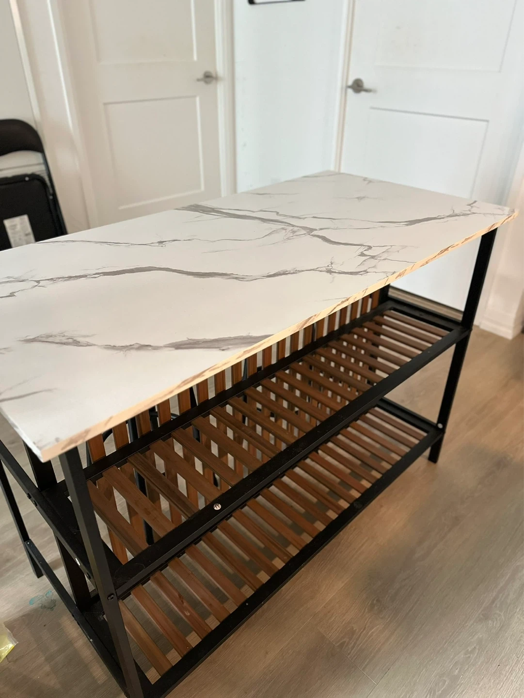 This kitchen island features a white marble-look countertop and two slatted wooden shelves. It has a black metal frame. Provides extra counter space and storage.