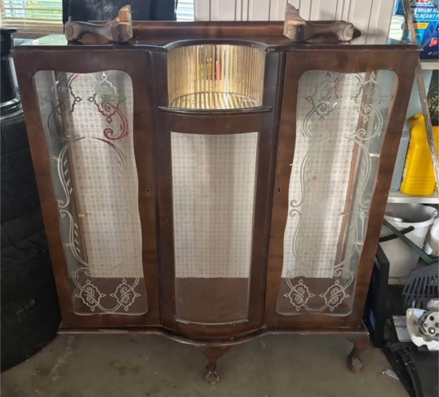 Beautiful vintage display cabinet made of dark wood. It features glass doors with decorative etching and a unique curved top section. This cabinet offers stylish storage and display space.