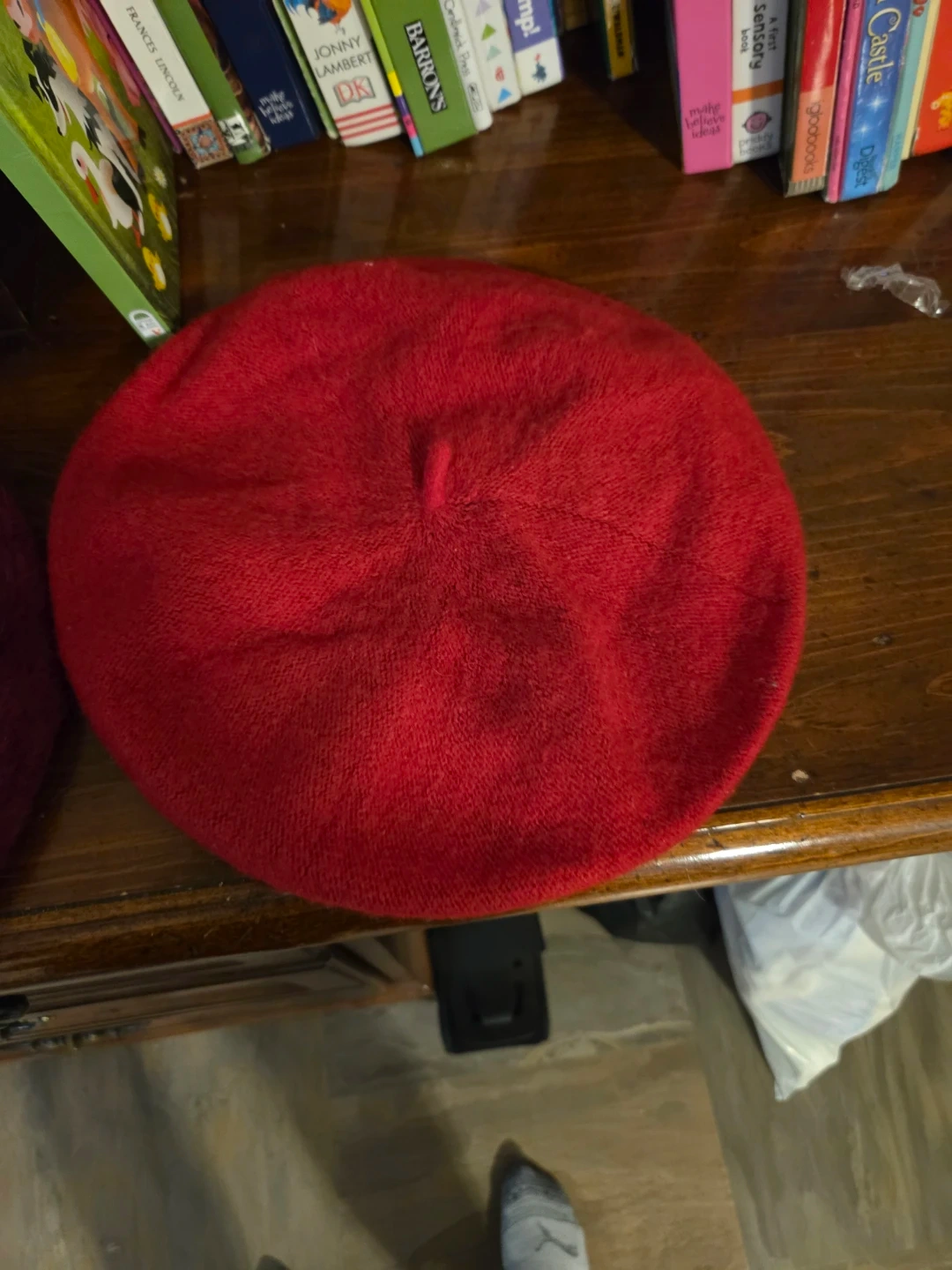 A classic red beret, perfect for adding a touch of style to any outfit. It's made of a soft, knitted material. This hat is a great accessory for cooler weather!