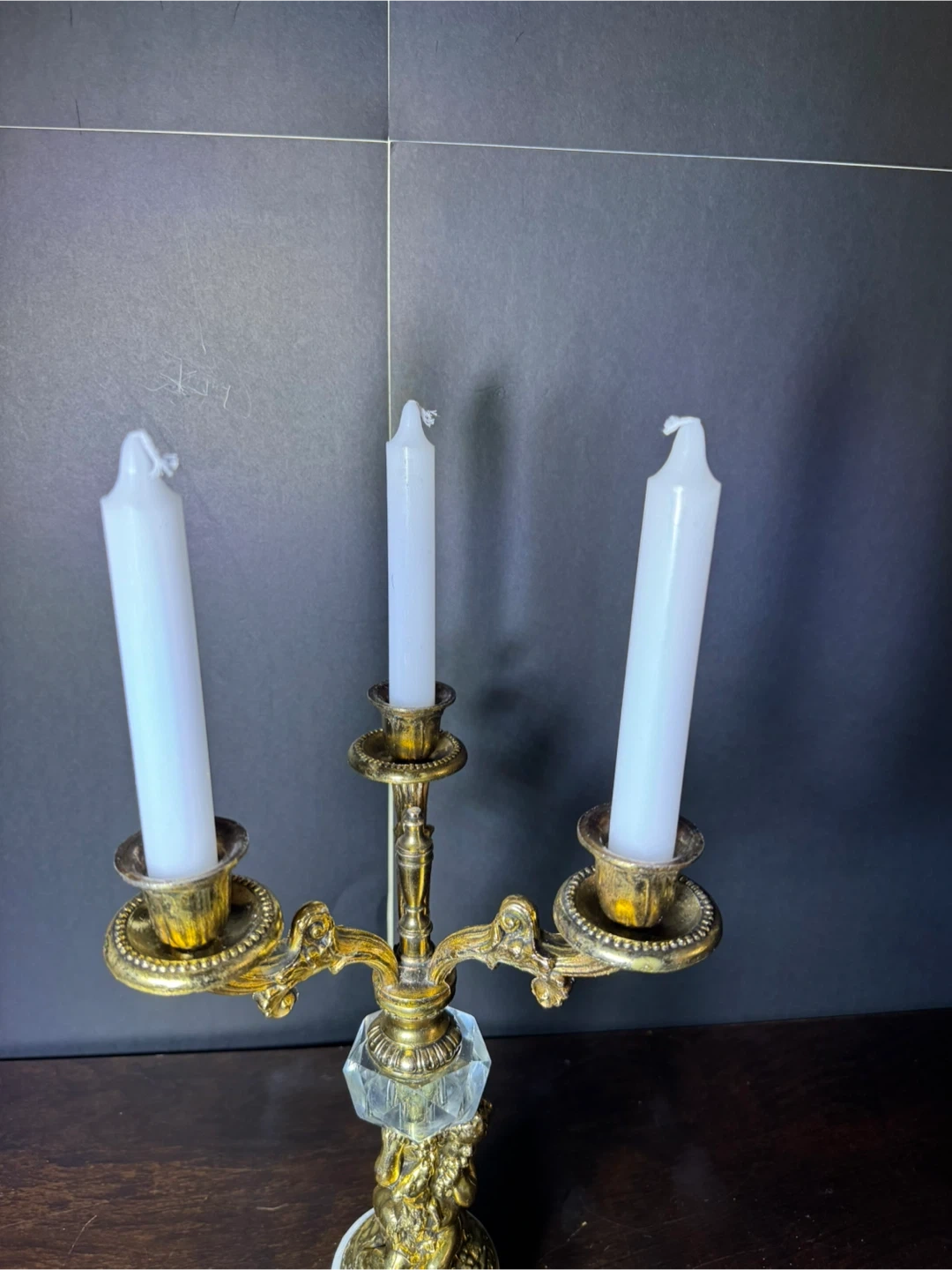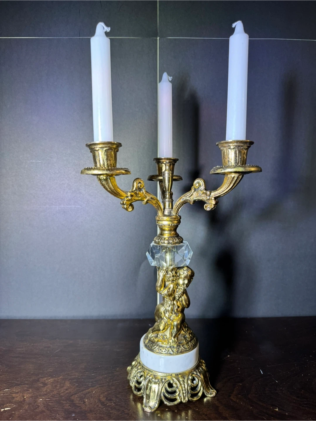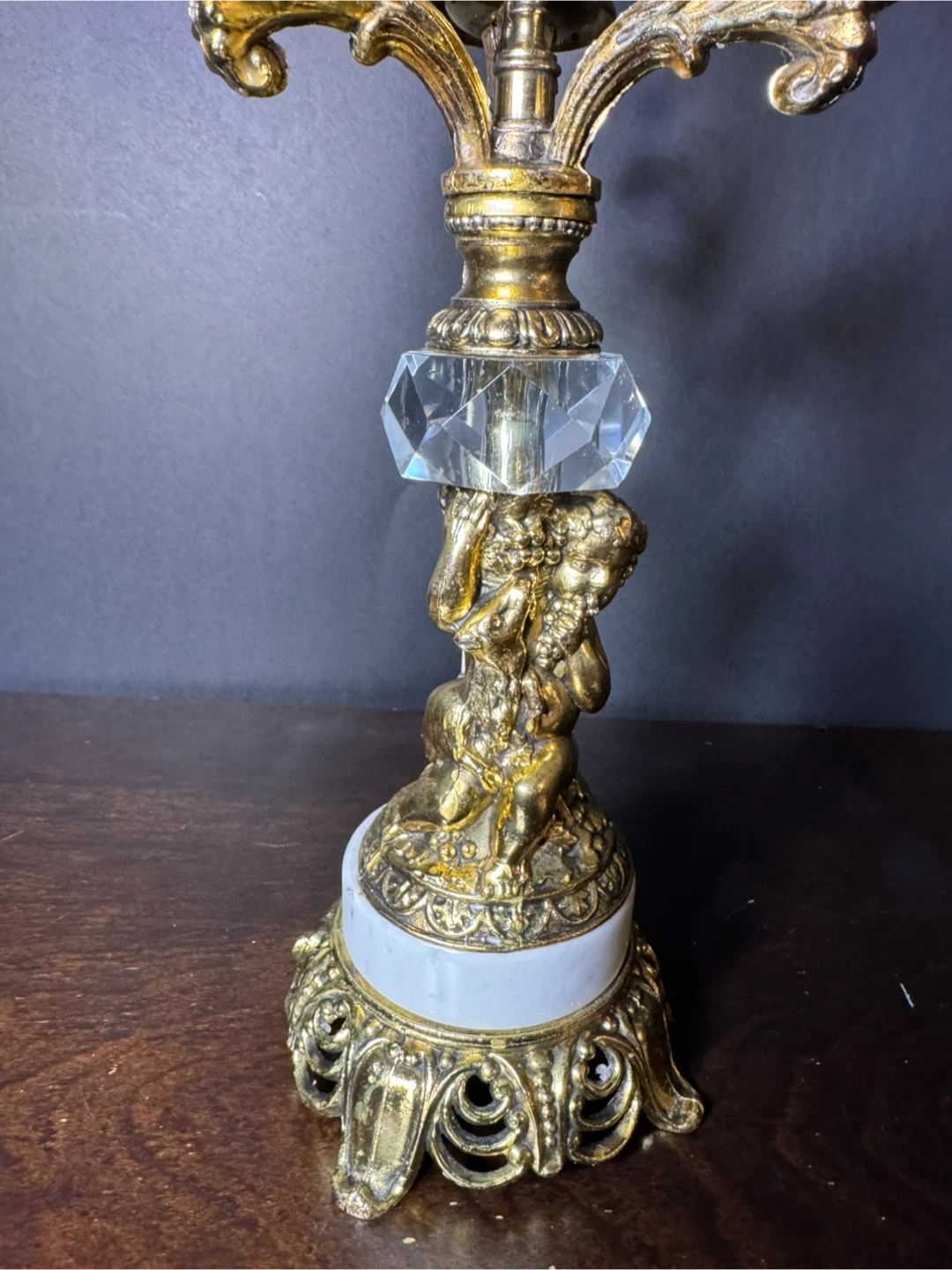 This ornate candelabra features a gold-tone brass finish with crystal accents and cherub detailing. It's 12 inches high and 8 inches wide.