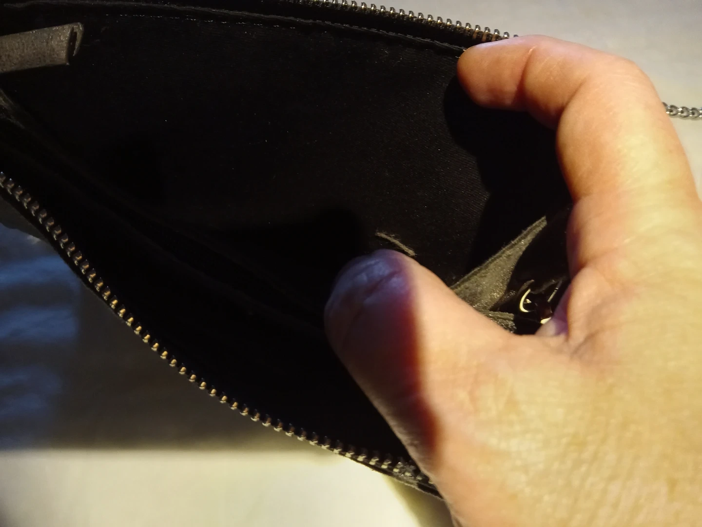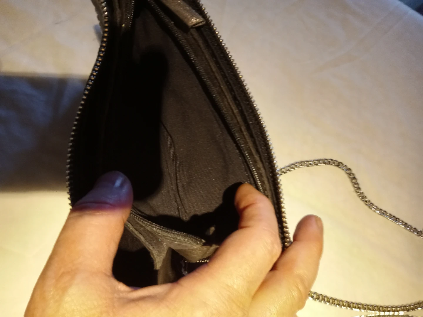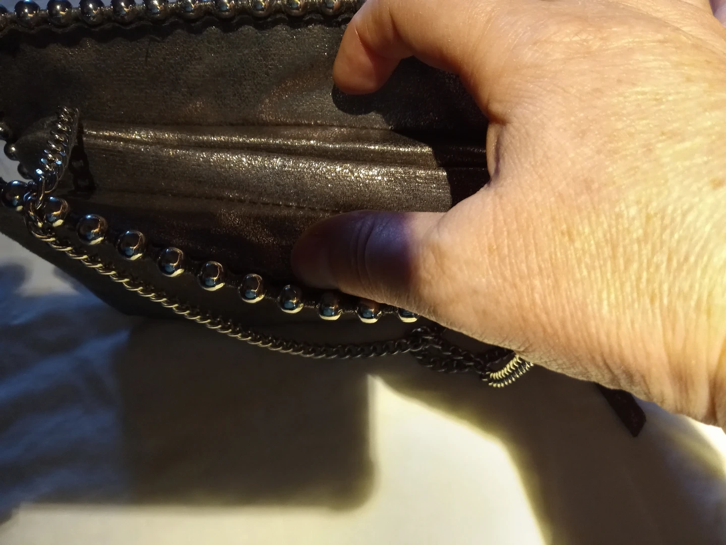 A stylish dark grey clutch purse with silver-toned stud detailing along the edges. It features a convenient zipper closure and a detachable silver chain strap. The interior has multiple compartments for organizing your essentials. It's perfect for evenings out or special occasions!