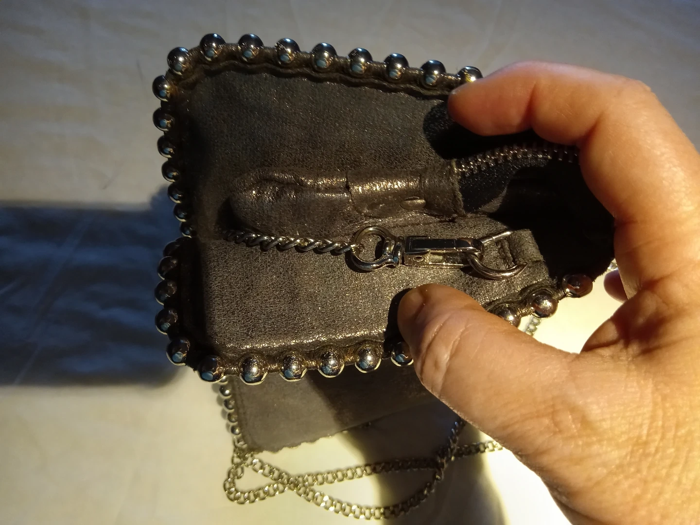 A stylish dark grey clutch purse with silver-toned stud detailing along the edges. It features a convenient zipper closure and a detachable silver chain strap. The interior has multiple compartments for organizing your essentials. It's perfect for evenings out or special occasions!